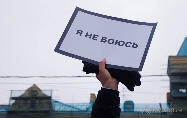 Чуть позже одессит сообщил: «Меня задержала полиция. Отвели в автозак, отбирали паспорт. Потом паспорт вернули и вывели из автозака, ударили. Сейчас держат возле автозака, не отпускают. Я ничего не выкрикивал, плакатов и флагов не нес – задержали просто за футболку».