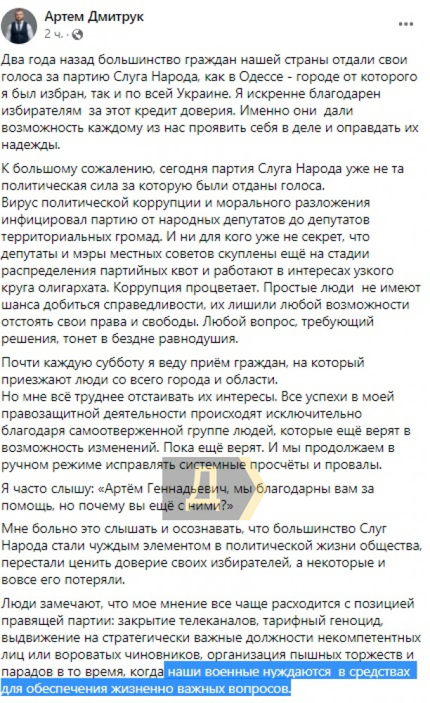 Дмитрук голосовал против инициированного «слугами» отзыва Дмитрия Разумкова с поста председателя Верховной Рады и назначения на этот пост Руслана Стефанчука. Помимо этого, недавно нардеп дал интервью попавшему под санкции Совета нацбезопасности и обороны Украины пророссийскому изданию «Шарий.net», в котором сообщил, что готов стать исключенным из фракции.