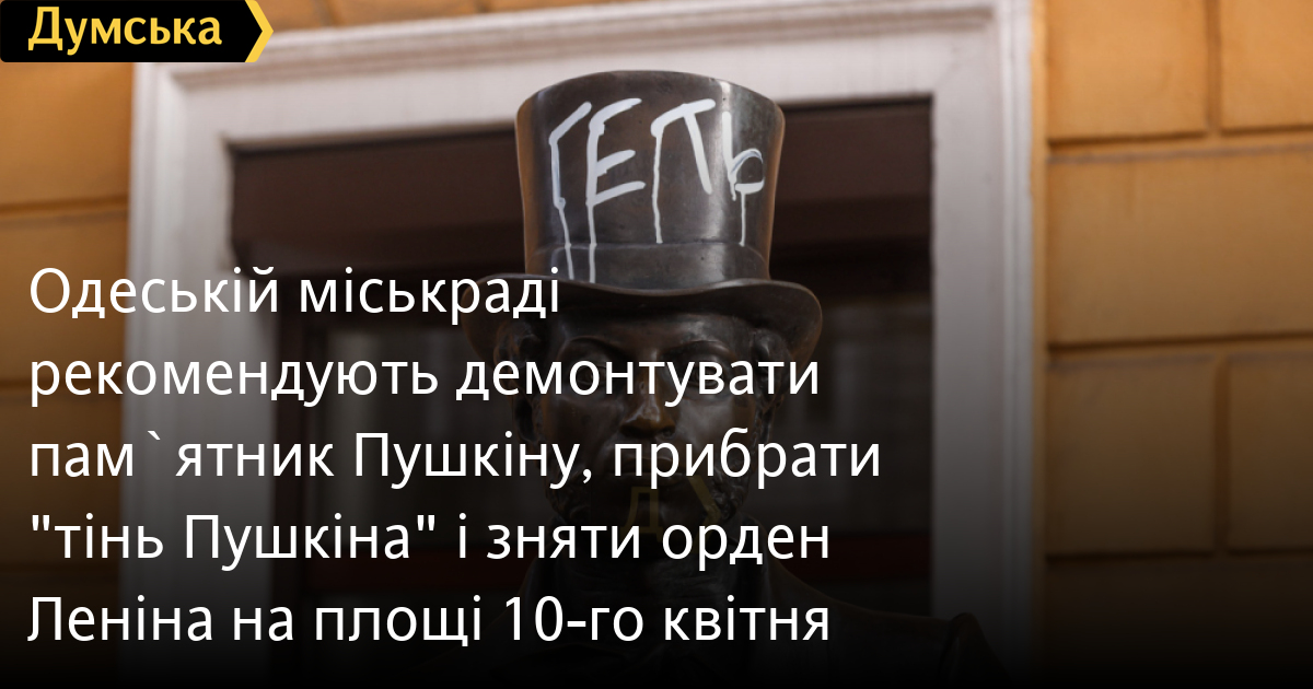 Також комісія постановила прибрати «тінь Пушкіна» з перехрестя Рішельєвської та Дерибасівської вулиць. Крім того, нарешті було розглянуто питання доречності великого зображення ордена Леніна на постаменті стели на площі 10-го квітня — члени комісії виступили за декомунізацію об'єкта.