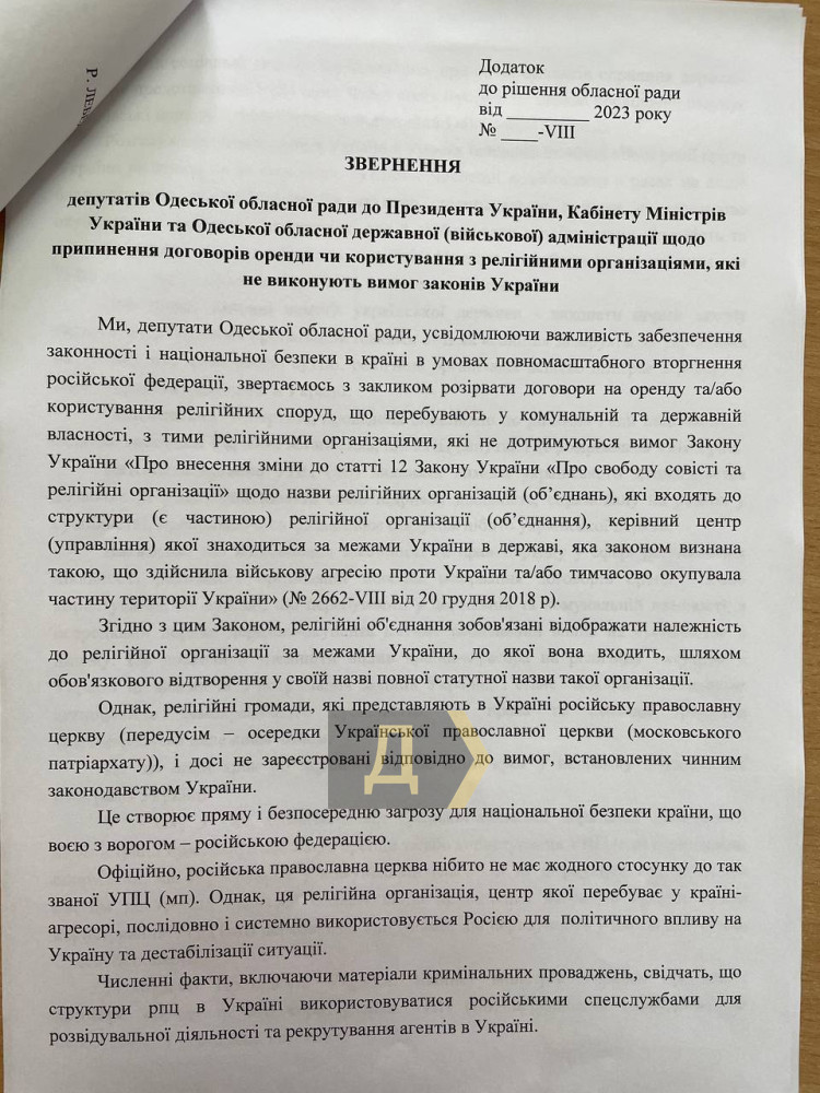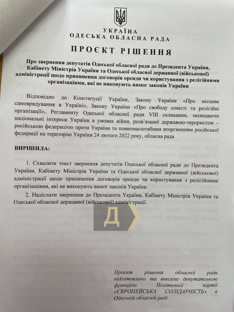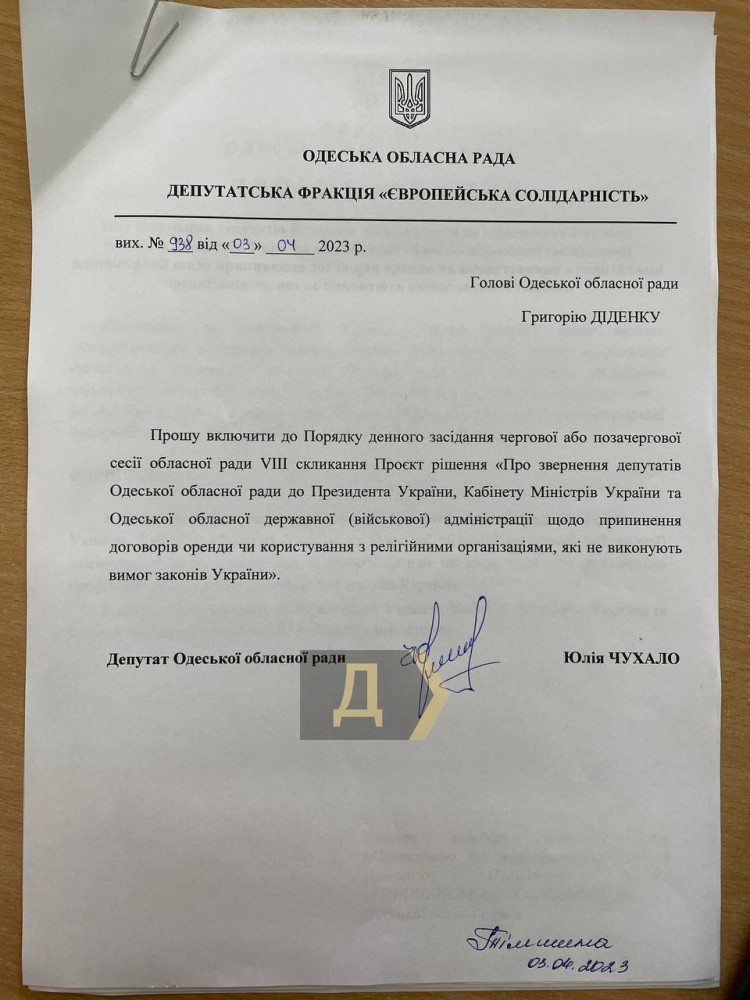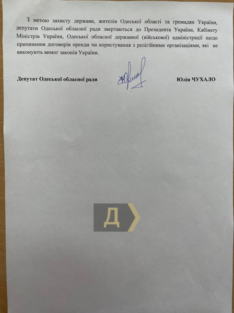 Проєкт звернення до президента, Кабінету міністрів та голови обласної військової адміністрації щодо припинення договорів оренди або використання майна громад релігійними організаціями, які не виконують вимоги українського законодавства, пропонує винести на наступну сесію облради депутатка від «Європейської Солідарності» Юлія Чухало.
