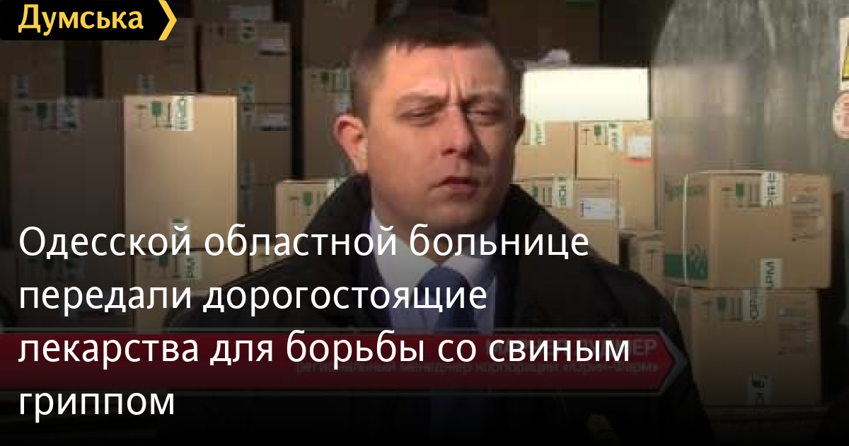 Одесской областной больнице передали дорогостоящие лекарства для борьбы со свиным гриппомОдесской областной больнице передали дорогостоящие лекарства для борьбы со свиным гриппом. Помощь оказала фармацевтическая компания Юрия-Фарм. Пока эпидемиологический барьер в области не превышен, но больницы загружены больше, чем обычно в это время года. СМЕРТЬ РОССИЙСКИМ ОККУПАНТАМ! Заметили ошибку? Выделяйте слова с ошибкой и нажимайте control-enter Думская ТВ. Сюжеты:
