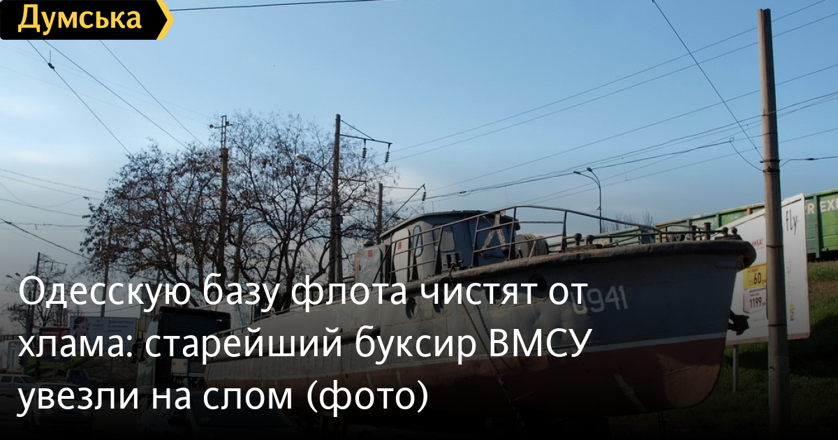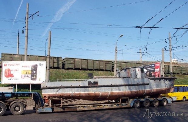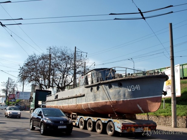 Корреспондент Думской сфотографировал сегодня единицу Военно-морских сил Украины прямо на улице Одессы. Автотрейлер, на котором везли давным-давно выведенный из боевого состава ВМСУ рейдовый буксир «БУК-239» (бортовой U941), ехал по Приморской, а потом свернул на Черноморского Казачества.