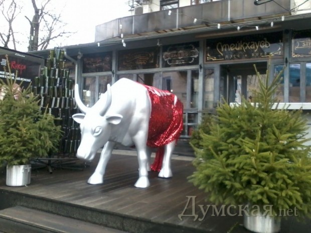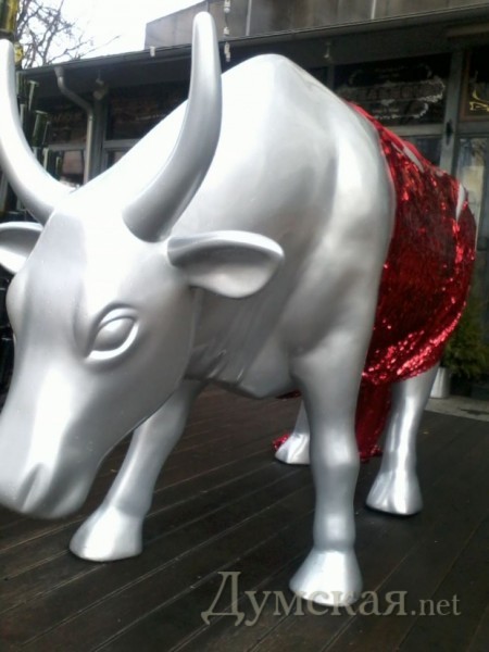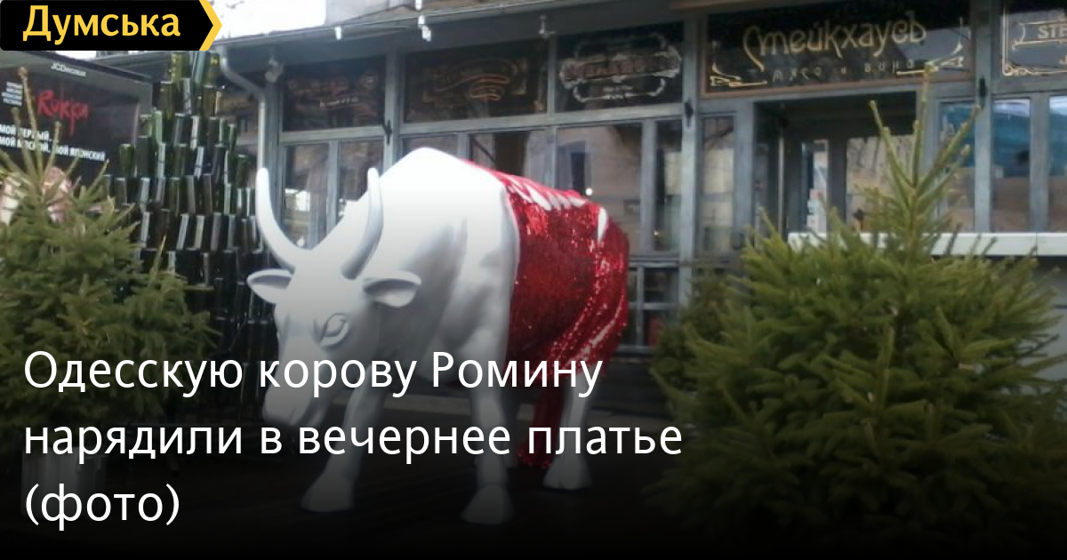 Корову Ромину, установленную на Дерибасовской в Одессе, одели в вечернее платье со шлейфом.