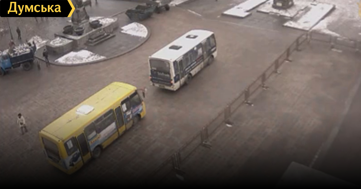 Кроме того, как показывает вебкамера, сейчас на Думской площади стоят два автобуса с неизвестными внутри. А наш корреспондент добавляет, что рядом припаркованы грузовички с бойцами внутренних войск. Всего их примерно пятьдесят человек.