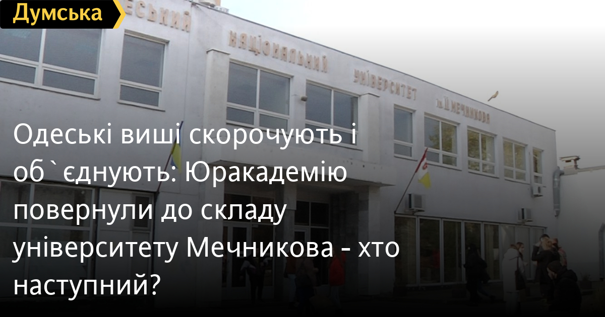 Зазначається, що реорганізація не вплине негативно на студентів. «Вони продовжать навчання за тими ж самими освітніми програмами, на які вступили, без змін умов фінансування, — йдеться в повідомленні. — Зберігаються бюджетні місця та вартість контрактів. Перехід програм Юракадемії до Одеського національного університету імені Мечникова відбудеться поступово протягом 2025 року». Питаннями передачі майна та узгодження штатного розпису нового укрупненого університету займеться комісія на чолі з ректором ОНУ В'ячеславом Трубою. «Права науково-педагогічних працівників двох установ захищені за винятком керівного складу, до якого належать посади президента, ректора та проректорів», — підкреслюють у міністерстві. Одеську юридичну академію утворили, виділивши зі складу Одеського університету імені Мечникова (тоді там існував юридичний інститут) 1997 року. Згодом в ОНУ відтворили правовий (економіко-правовий) факультет, який з 2006 по 2020 роки очолював доктор юридичних наук, професор В'ячеслав Труба. «Основною причиною перегляду мережі закладів вищої освіти є демографічна ситуація. За останні півтора десятка років середня кількість студентів на один заклад вищої освіти зменшилася з 6,5 тис. до 3,5 тис. Політику укрупнення закладів вищої освіти реалізують заради поліпшення якості, посилення спроможності університетів через об'єднання їхніх ресурсів та заради залучення інвестицій в оновлення їхньої науково-навчальної інфраструктури», — пояснюють в освітньому відомстві. Раніше, нагадаємо, до Одеського університету Мечникова приєднали Одеський державний екологічний університет. Одночасно розпочався процес злиття Національного університету «Одеська морська академія» та Одеського національного морського університету. Про те, що уряд узяв курс на радикальне скорочення мережі вищих навчальних закладів, «Думська» писала ще рік тому. Виші об'єднуватимуть за профілем: інженерні з інженерними, гуманітарні з гуманітарними і так далі. Не чіпатимуть лише військові, педагогічні та медичні навчальні заклади. В Одесі має залишитися п'ять-сім цивільних вишів: академічний університет (ОНУ імені Мечникова), педагогічний, медичний, інженерний (технологічний, політехнічний) і морський університети, а також музична й архітектурно-будівельна академія.