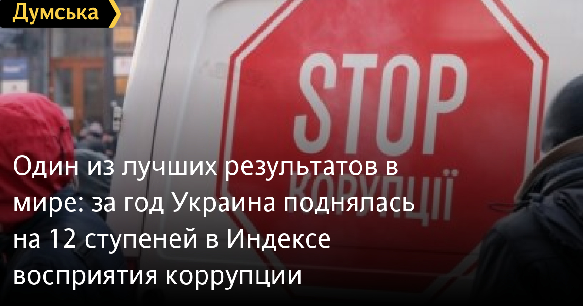 Один із найкращих результатів у світі: за рік Україна піднялася на 12 сходинок в Індексі сприйняття корупціїНа 12 сходинок піднялася Україна в Індексі сприйняття корупції (Corruption Perceptions Index) за 2023 рік, отримавши 36 можливих балів зі 100. Тепер наша країна посідає 104 місце серед 180 країн. За рік держава продемонструвала зростання на три бали, що є одним із найкращих результатів минулого року у світі. Крім того, за інформацією експертів, Україна стала однією з 17 країн, які продемонстрували свій найкращий показник за весь час. За останні десять років, з часів Революції Гідності та початком великого реформування, Україна загалом додала 11 балів у дослідженні, а зростання фіксувалося навіть під час повномасштабної війни. У Transparency International Ukraine зазначили, що підйому України сприяли такі чинники, як: - завершення конкурсів з обрання керівників НАБУ та АРМА, старт конкурсу з відбору голови НАЗК. - оновлення Вищої ради правосуддя та Вищої кваліфікаційної комісії суддів, запущено процес відбору п'яти нових суддів Конституційного Суду України. - відкриття більшості даних, які мають бути публічними за законодавством. - проведення публічних закупівель у Prozorro. Світовими лідерами Індексу сприйняття корупції 2023 року залишаються Данія з 90 балами, Фінляндія (87 балів), Нова Зеландія (85 балів) і Норвегія (84 бали). Помітили помилку? Виділяйте слова з помилкою та натискайте control-enter |