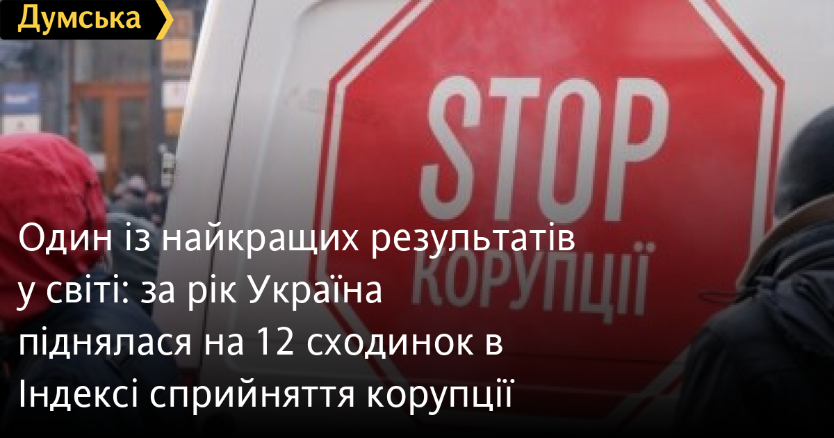 Один із найкращих результатів у світі: за рік Україна піднялася на 12 сходинок в Індексі сприйняття корупціїНа 12 сходинок піднялася Україна в Індексі сприйняття корупції (Corruption Perceptions Index) за 2023 рік, отримавши 36 можливих балів зі 100. Тепер наша країна посідає 104 місце серед 180 країн. За рік держава продемонструвала зростання на три бали, що є одним із найкращих результатів минулого року у світі. Крім того, за інформацією експертів, Україна стала однією з 17 країн, які продемонстрували свій найкращий показник за весь час. За останні десять років, з часів Революції Гідності та початком великого реформування, Україна загалом додала 11 балів у дослідженні, а зростання фіксувалося навіть під час повномасштабної війни. У Transparency International Ukraine зазначили, що підйому України сприяли такі чинники, як: - завершення конкурсів з обрання керівників НАБУ та АРМА, старт конкурсу з відбору голови НАЗК. - оновлення Вищої ради правосуддя та Вищої кваліфікаційної комісії суддів, запущено процес відбору п'яти нових суддів Конституційного Суду України. - відкриття більшості даних, які мають бути публічними за законодавством. - проведення публічних закупівель у Prozorro. Світовими лідерами Індексу сприйняття корупції 2023 року залишаються Данія з 90 балами, Фінляндія (87 балів), Нова Зеландія (85 балів) і Норвегія (84 бали). Помітили помилку? Виділяйте слова з помилкою та натискайте control-enter |