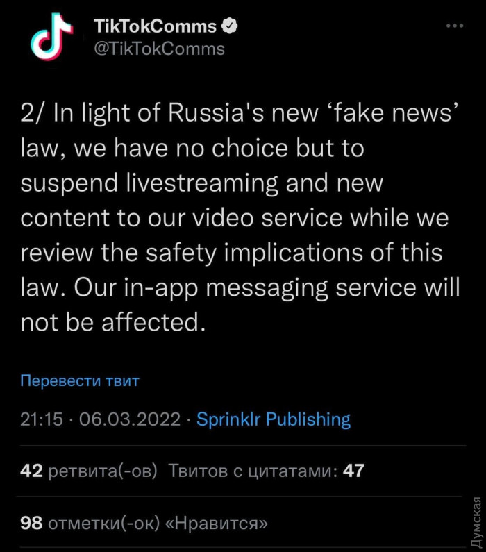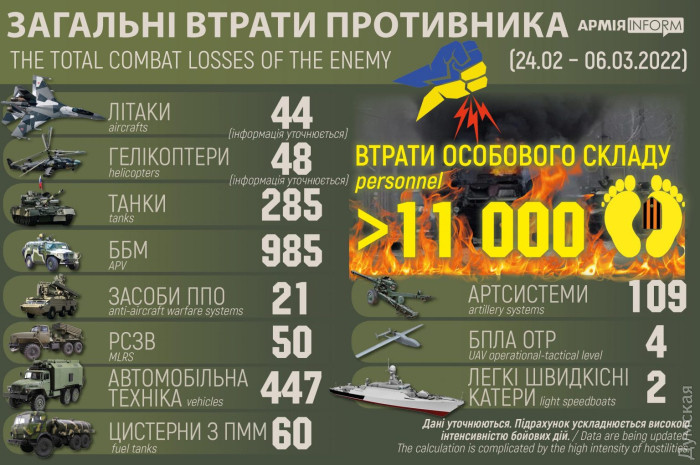 Одиннадцатый день полномасштабного вторжения: наша армия дает отпор врагу на земле, в воздухе и на воде (фото, видео, обновляется)Продолжается открытое нападения РФ на Украину, которое Путин начал 24 февраля в 5 утра. ОБНОВЛЕНО В 21:19. Мэр города Ирпень, что в пригородах Киева, Александр Маркушин сообщил, что сегодня утром при эвакуации мирных жителей автобус попал под вражеский обстрел и погибли восемь мирных граждан, в том числе семья с двум маленькими детьми. Он добавил, что оккупанты частично заняли Ирпень, но город не сдан, продолжаются бои. ОБНОВЛЕНО В 21:12. Мэр Харькова Игорь Терехов сообщил, что в результате обстрела телевышки оказался поврежден лишь один кабель. Его уже чинят и скоро теле- и радиовещание возобновится. Тем временем еще один вражеский снаряд попал в жилой дом рядом с областной прокуратурой. Начался сильный пожар. Известно о том, что в доме погибла пенсионерка. Судьба еще одной пожилой женщины устанавливается. ОБНОВЛЕНО В 20:57. Интересное видео — полицейский спецназ КОРД уничтожает два танка оккупантов в Киевской области. ОБНОВЛЕНО В 20:50. В СМИ появилась информация о том, что с 10 марта РФ планирует полностью отрезать себя от интернета и замкнуться на внутреннюю сеть. ОБНОВЛЕНО В 20:40. У россиян станет еще на одну соцсеть меньше. Сервис TikTok сообщил об останоке работы на территории РФ. Напомним, раньше роскомнадзор заблокировал Фейсбук и Твитер. Предпринимаются попытки блокировать Ютуб. ОБНОВЛЕНО В 20:35. Укранская разведка установила, что из-за огромных потерь российская армия начала проводить скрытую мобилизацию. Гештаб Вооруженных сил Украины сообщил, что в Краснодарском крае начали агитировать мужчин вступать в ряды армии и идти «спасать» Украину от «нацистов». Используются пропагандистские материалы, в которых говорится о «фашистской хунте в Киеве». ОБНОВЛЕНО В 20:42. Штаб обороны Харьковской области сообщил, что один из пилотов сбитого несколько часов назад Су-25 остался жив. Его ищут в области. Всех жителей региона призывают присоединиться к поимке врага, желательно схватить его живым. ОБНОВЛЕНО В 20:12. Силы специальных операций Вооруженных сил Украины продолжают работать по вражеским тылам. Результатом очередного успешного рейда стал трофейный танк оккупантов. ОБНОВЛЕНО В 20:03. Госспецсвязь сообщает: в результате вражеского обстрела получила повреждение телевышка в Харькове. Телевизионный эфир и радио на территории региона временно не работают. ОБНОВЛЕНО В 19:53. Воздушные силы Вооруженных сил Украины уточнили информацию о ракетном ударе по аэродрому Винницы. Удар был нанесен с южного направления — из акватории Черного моря. Ракеты Х-101 с дальностью полета 5500 км выпустили стратегические бомбардировщики-ракетоносцы Ту-95мс или Ту-160, которые взлетели из временно оккупированного Крыма. ОБНОВЛЕНО В 19:47. Сегодня подразделение российских десантников в Николаевской области просто бросило свою технику в поле и разбежалось. Это произошло даже до столкновения с украинской армией. ОБНОВЛЕНО В 18:43. Губернатор Харьковской области Олег Синегубов сообщил, что система ПВО сбила над городом российский штурмовик Су-25. Ракета поразила самолет над Харьковским авиационным заводом, обломки рухнули у пгт Кулиничи. ОБНОВЛЕНО В 18:29. Сухопутные силы Вооруженных сил Украины сообщили, что только что над Харьковом был сбит еще один р
