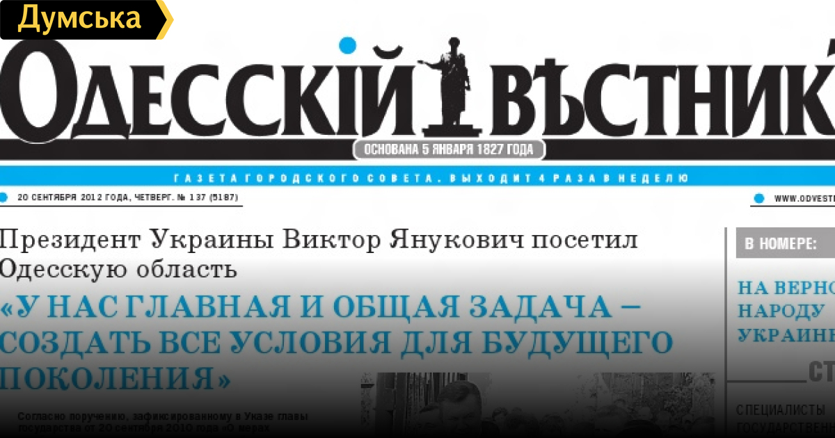 Не врите мэру! «Одесскому вестнику» 21 год, а не «два века», потому что к дореволюционному ОВ этот лживый говнолисток никакого отношения не имеет. Только название одно. Эдак и «Думскую» переименуют в какую-нибудь «Искру» и заявят, что ее сам Ленин основал.