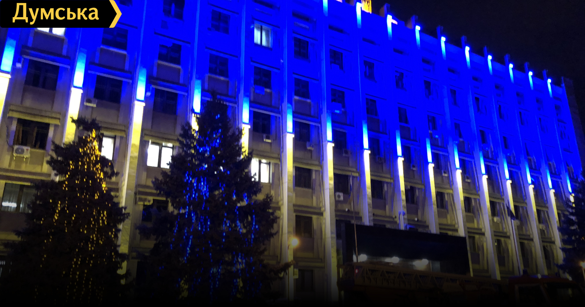 Патриотическая новогодняя подсветка появилась на здании Одесского облсовета. Фасад теперь светится желто-голубым, гармонично сочетаясь с украшенными к празднику елями.