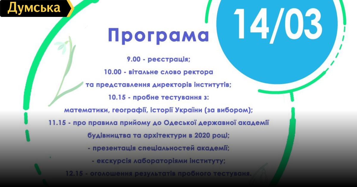 Одесская строительная академия зовет на первый весенний день открытых дверей (общество, обновлено)Одесская государственная академия строительства и архитектуры приглашает на день открытых дверей, который состоится 14 марта. Всех желающих познакомиться с работой ведущего строительного вуза страны ждут на Старопортофранковской, 28 в 09:00. Преподаватели ОГАСА расскажут все нюансы поступления на различные специальности: ЗНО по каким предметам необходимо сдать, как поступить на бюджетное место, какова стоимость контрактного обучения, какие существуют образовательные программы. Также вы сможете пройти пробное тестирование по географии, математике и истории Украины. Зарегистрироваться можно через онлайн-форму, а также на самом дне открытых дверей. ОБНОВЛЕНО 12 марта. Внимание в связи с карантином, введенным правительством из-за пандемии коронавируса, день открытых дверей отменяется. СМЕРТЬ РОСІЙСЬКИМ ОКУПАНТАМ! Помітили помилку? Виділяйте слова з помилкою та натискайте control-enter Новини по цій темі: 28 вересня 2024: Відновлення пошкоджених будівель і дефіцит кадрів: науковці обговорили перспективи розвитку будівельного комплексу Одеси (фото) 25 вересня 2024: З покет-парком і графіті-стіною: студенти будівельної академії відновлять найсуворіший баскетбольний майданчик Одеси 8 серпня 2024: Напередодні Дня будівельника в Одесі вшановували найкращих співробітників галузі (фото) 28 червня 2024: Український Polygon у Фінляндії: одеські студенти-архітектори представили проєкт перетворення кампусу Гельсінського університету (фото, відео) 15 листопада 2023: У центрі Одеси відкриють музей геноцидів "Територія пам`яті": концепт розробляють студенти та викладачі будівельної академії (фото) |