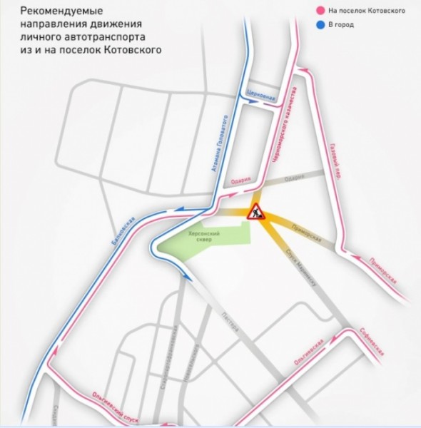 Как сообщает пресс-служба горсовета, по улице Атамана Головатого на участке от Пересыпского моста до Одария организовывается двухстороннее движение. Движение автотранспорта в сторону поселка Котовского будет организовано с улицы Балковской по двум полосам Атамана Головатого, по улице Одария (две полосы с односторонним движением) и далее по Черноморского казачества. Движение с Приморской улицы — через Газовый переулок и далее на Черноморского казачества. Проезд автотранспорта к Пересыпским мостам по спуску Маринеско будет закрыт.