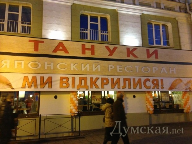 На днях в Одессе открылся «японский» ресторан «Тануки», принадлежащую российскому холдингу «Лайт-Лайф» (основан в 2001-м году бизмесменом Орловым). Заведение разместилось на красивейшей площади города – Екатерининской, — в том же помещении, где когда-то работал ресторан «Валдай».