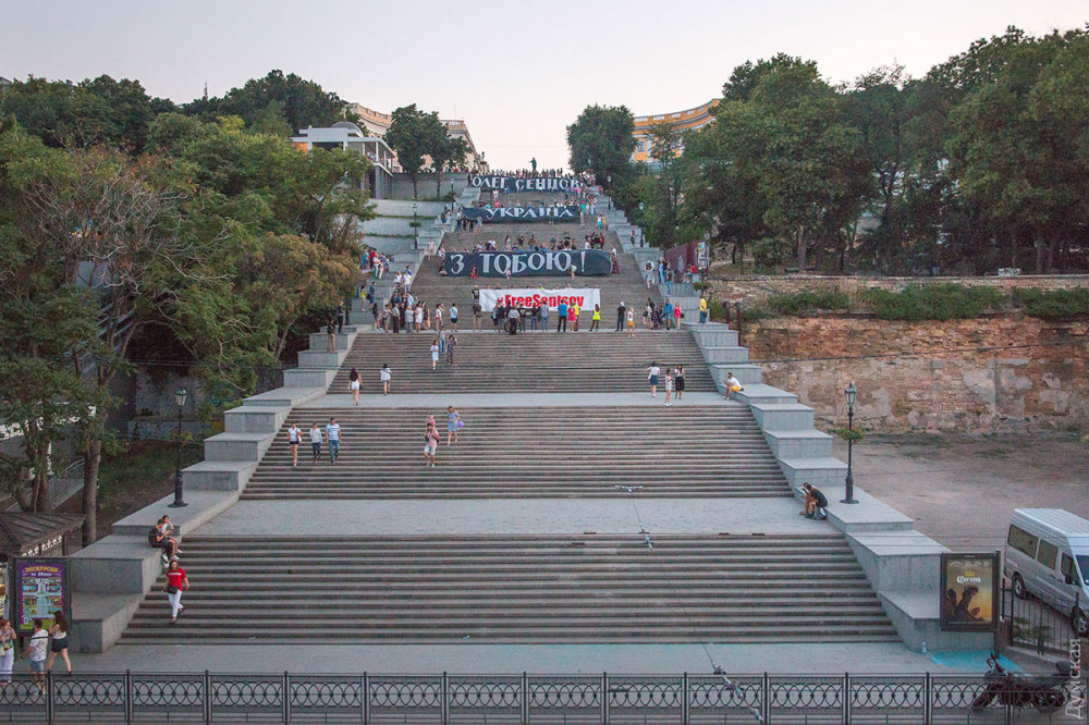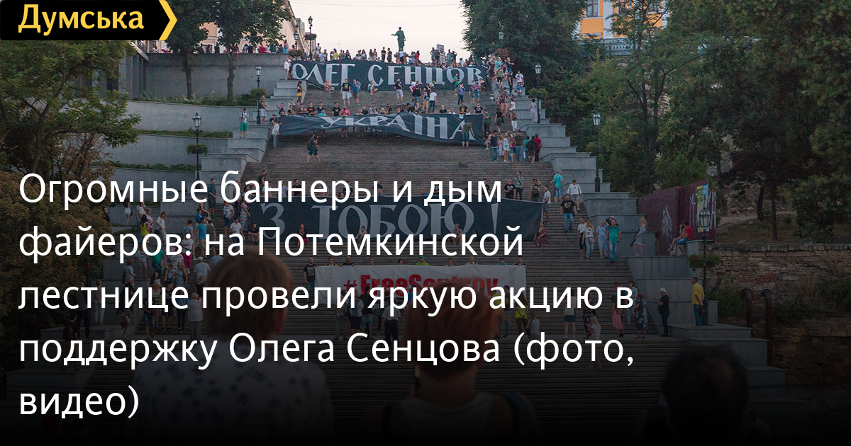 Огромные баннеры и дым файеров: на Потемкинской лестнице провели яркую акцию в поддержку Олега СенцоваМасштабная акция в поддержку политических заключенных, удерживаемых в российских и крымских тюрьмах, прошла сегодня на Потемкинской лестнице. Одесситы с огромными баннерами с надписью «Олег Сенцов, Украина с тобой» выстроились на ступенях и зажгли файеры. «Идея пришла в голову после того, как увидели акцию на НСК «Олимпийский» в Киеве, — рассказала организатор мероприятия Татьяна Петракевич. — Патриотическая общественность города поддержала идею, а киевляне передали нам баннеры с надписью». «Уже более четырех лет украинцы находятся в тюрьмах России по незаконным обвинениям, — говорит Петракевич. — Олег Сенцов объявил голодовку в поддержку каждого из них. Этой акцией мы хотим показать всему миру, что Одесса с Олегом и переживает за всех своих соотечественников, которые платят своей свободой за право быть украинцами». В акции приняло участие более 100 человек. В конце мероприятия участники спели государственный гимн Украины. К слову, изначально акцию планировали провести на стадионе «Черноморец», но организаторам в этом отказали. Фото, видео — Александр Гиманов СМЕРТЬ РОСІЙСЬКИМ ОКУПАНТАМ! Помітили помилку? Виділяйте слова з помилкою та натискайте control-enter |