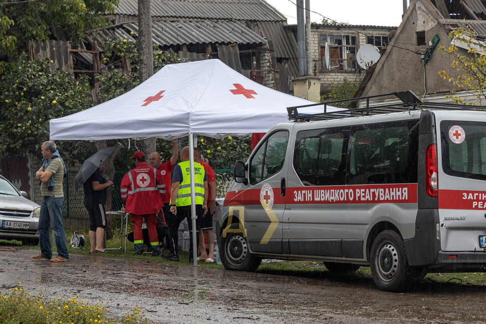Жителі та родичі, які приїхали на допомогу, як можуть, ліквідовують наслідки прильоту. На вулиці представники Червоного Хреста роздають плівку та інші будівельні матеріали, необхідні для первинного ремонту та консервації постраждалих приміщень.