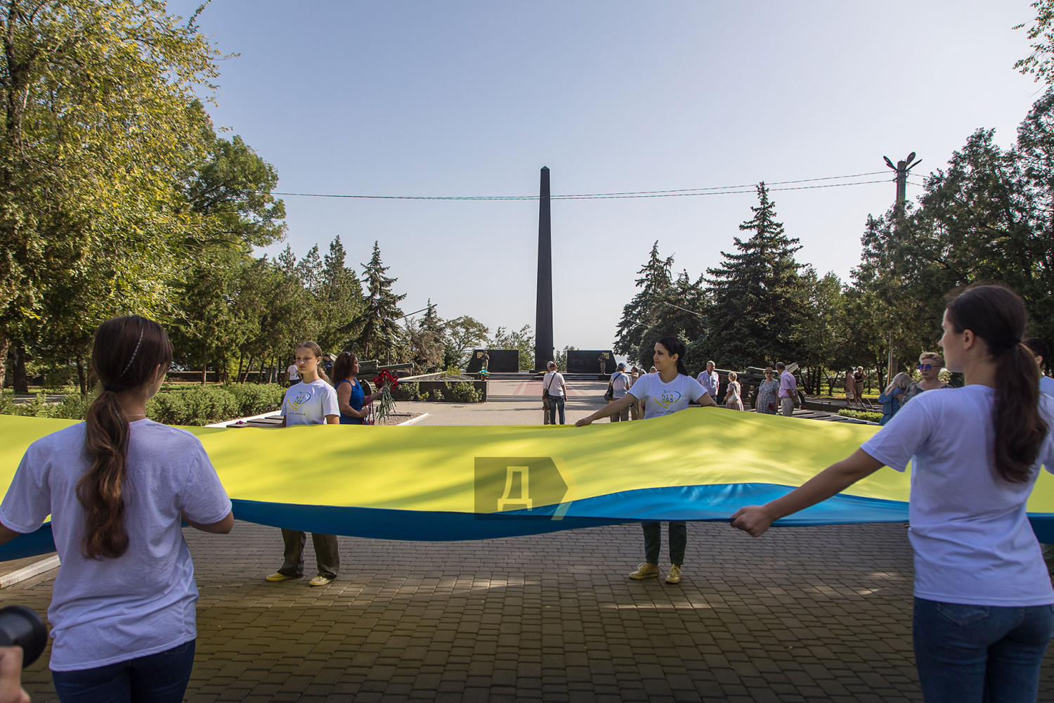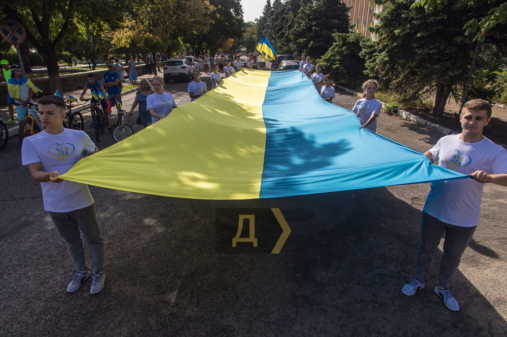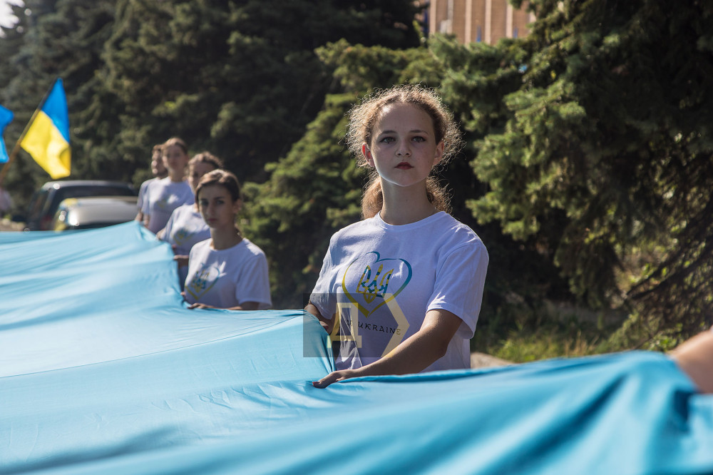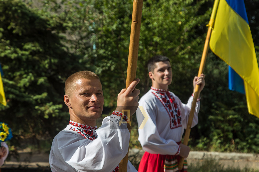 Урочисті заходи цього року розпочалися із покладання квітів на Меморіалі слави та винесення величезного державного прапора на площу перед пам'ятником.