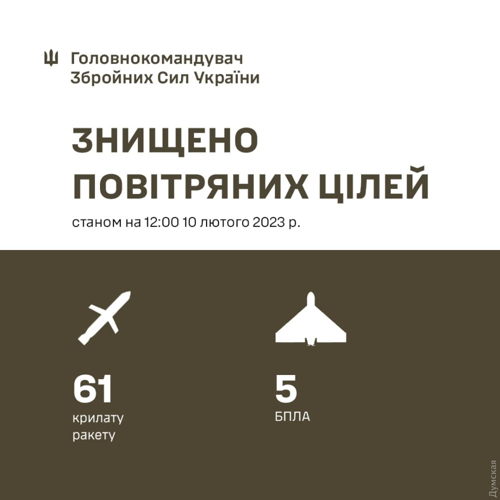 Окупанти атакували Україну 71 крилатою ракетою: ППО збила 61 з нихУранці 10 лютого рашисти випустили по Україні 43 крилаті ракети авіаційного базування Х-101 і Х-555, а також із кораблів у Чорному морі запустили 28 «калібрів». Як повідомив головнокомандувач Збройних сил України генерал Валерій Залужний, наше ППО знищило 61 крилату ракету. Також противник використав сім іранських дронів-камікадзе Shahed-136. Збито п'ять. Крім того, з Бєлгородської області рф і тимчасово окупованих територій Запорізької області російські нацисти випустили 35 ракет С-300. СМЕРТЬ РОСІЙСЬКИМ ОКУПАНТАМ! Помітили помилку? Виділяйте слова з помилкою та натискайте control-enter |