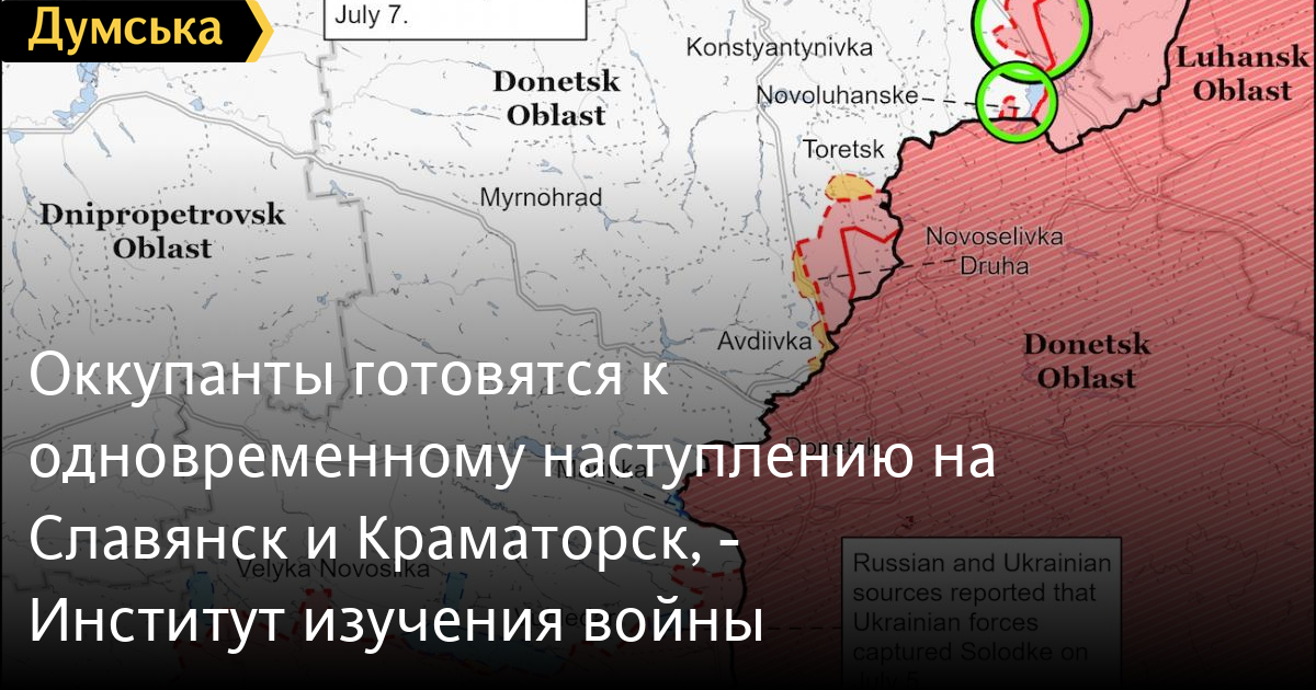 Как сообщают аналитики Института изучения войны (ISW), российские нацисты добились незначительных успехов на юго-восток от Северска и продолжили наступательные действия на запад от Лисичанска. Оккупанты нанесли артиллерийские удары к югу от Барвенкова и обстреляли Никополь, Новопавловку и несколько населенных пунктов на северо-запад от Славянска.