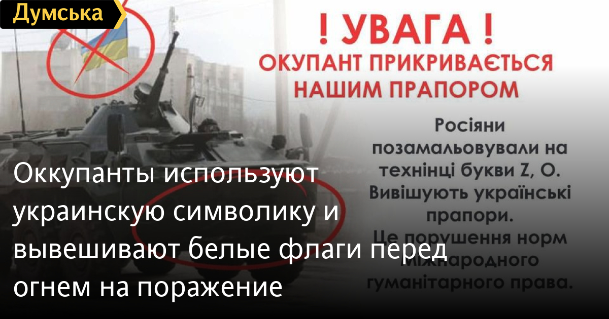 Оккупанты используют украинскую символику и вывешивают белые флаги перед огнем на поражениеОккупанты используют государственную символику Украины и вывешивают белые флаги на своей технике перед огнем на поражение. Украинские флаги вывешивают на колоннах российской военной техники, заявил главнокомандующий Вооруженными силами Валерий Залужный. Такие случаи замечены в населенных пунктах Победа, Новая Басань в Киевской области, на автодороге Красностав-Нежин Черниговской области. Кроме того, зафиксированы случаи, когда противник вывешивает белый флаг на своей технике якобы для того, чтобы сдаться. Однако, после приближения к украинским позициям, оккупанты начинают открывать огонь на поражение. Такие действия противника являются очередным подлым нарушением норм Международного гуманитарного права. СМЕРТЬ РОССИЙСКИМ ОККУПАНТАМ! Заметили ошибку? Выделяйте слова с ошибкой и нажимайте control-enter |
