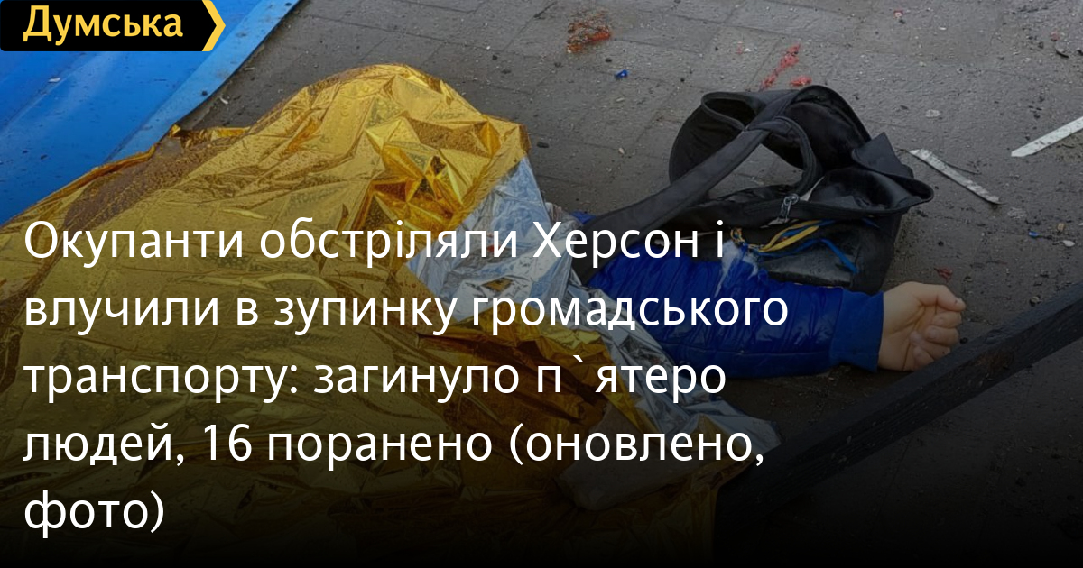 Окупанти обстріляли Херсон і влучили в зупинку громадського транспорту: загинуло п`ятеро людей, 16 поранено (оновлено, фото)Російські нацисти обстріляли житловий район Херсона з реактивної системи залпового вогню «Град» — у місті прогриміло щонайменше 20 вибухів. Очевидці обстрілу повідомляють, що ракети вибухнули в людних місцях — на зупинці громадського транспорту і біля магазину. Пресофіцер комендатури оборони Херсона Дмитро Плетенчук повідомив «Суспільному», що загинуло щонайменше шестеро цивільних. Кількість поранених встановлюється. В Оперативному командуванні «Південь» повідомили, що поранено щонайменше 12 осіб. Ці дані уточнюють. ОНОВЛЕНО О 16:24. У МВС повідомили, що внаслідок вибухів загинуло п'ятеро людей, поранено 16. П'ятеро загиблих перебували на розбомбленій зупинці. СМЕРТЬ РОСІЙСЬКИМ ОКУПАНТАМ! Помітили помилку? Виділяйте слова з помилкою та натискайте control-enter |