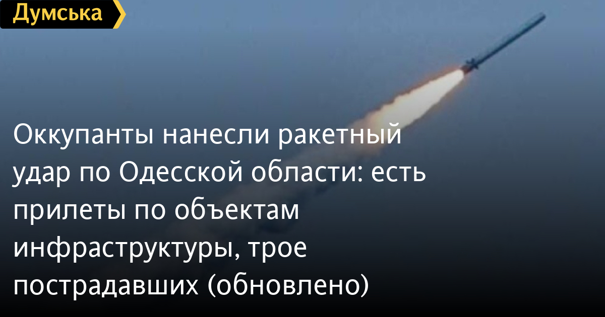 Окупанти завдали ракетного удару по Одеській області: є прильоти по об`єктах інфраструктури, троє постраждалих (оновлено)Чергового ракетного удару завдали російські окупанти по Одеській області в неділю, 5 листопада. Жителі Одеси та Чорноморська чули вибухи. Як стало відомо «Думській», є влучання по об'єктах інфраструктури в Одеському районі. ОНОВЛЕНО. Ворог спрямував по нашому регіону протирадіолокаційну ракету Х-31П, запущену з літака тактичної авіації. «В Одеській області пріоритети ворога зосереджені на протидії цивільному судноплавству. Попаданням в інфраструктурний об'єкт пошкоджено адміністративні будівлі. Постраждали три співробітники. Вибухова хвиля завдала пошкоджень і навколишнім будинкам», — повідомили в оперативному командуванні «Південь». СМЕРТЬ РОСІЙСЬКИМ ОКУПАНТАМ! Помітили помилку? Виділяйте слова з помилкою та натискайте control-enter |