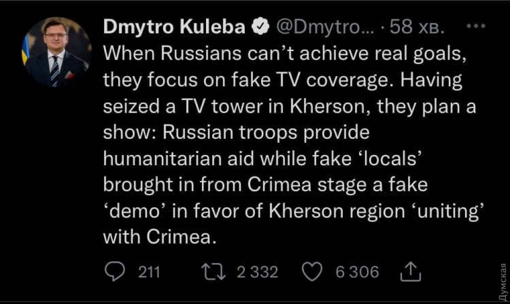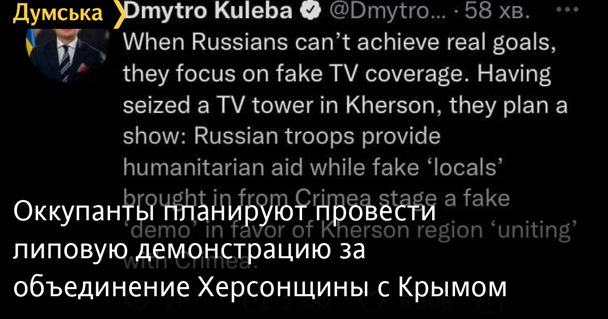 «Когда россияне не могут достичь реальных целей, они сосредотачиваются на фейковых телетрансляциях. Захватив телебашню в Херсоне, они планируют шоу: российские войска оказывают гуманитарную помощь, а липовые местные, привезенные из Крыма, устраивают липовую демонстрацию в пользу объединения Херсонщины с Крымом», — рассказал Кулеба.