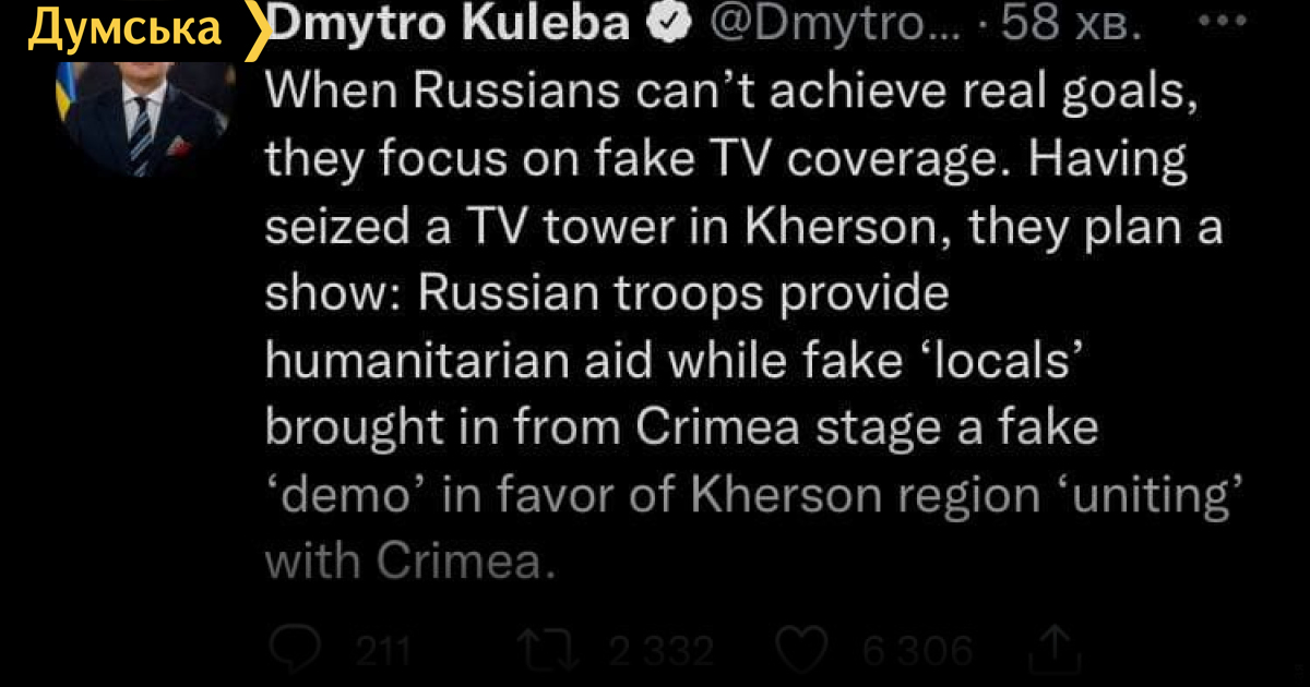 Оккупанты планируют провести липовую демонстрацию за объединение Херсонщины с КрымомЛиповую демонстрацию планируют провести завтра российские оккупанты временно удерживающие Херсон. Как рассказал министр иностранных дел Дмитрий Кулеба, специально для этого с оккупированного полуострова сегодня ночью завозят массовку. «Когда россияне не могут достичь реальных целей, они сосредотачиваются на фейковых телетрансляциях. Захватив телебашню в Херсоне, они планируют шоу: российские войска оказывают гуманитарную помощь, а липовые местные, привезенные из Крыма, устраивают липовую демонстрацию в пользу объединения Херсонщины с Крымом», — рассказал Кулеба. СМЕРТЬ РОСІЙСЬКИМ ОКУПАНТАМ! Помітили помилку? Виділяйте слова з помилкою та натискайте control-enter |