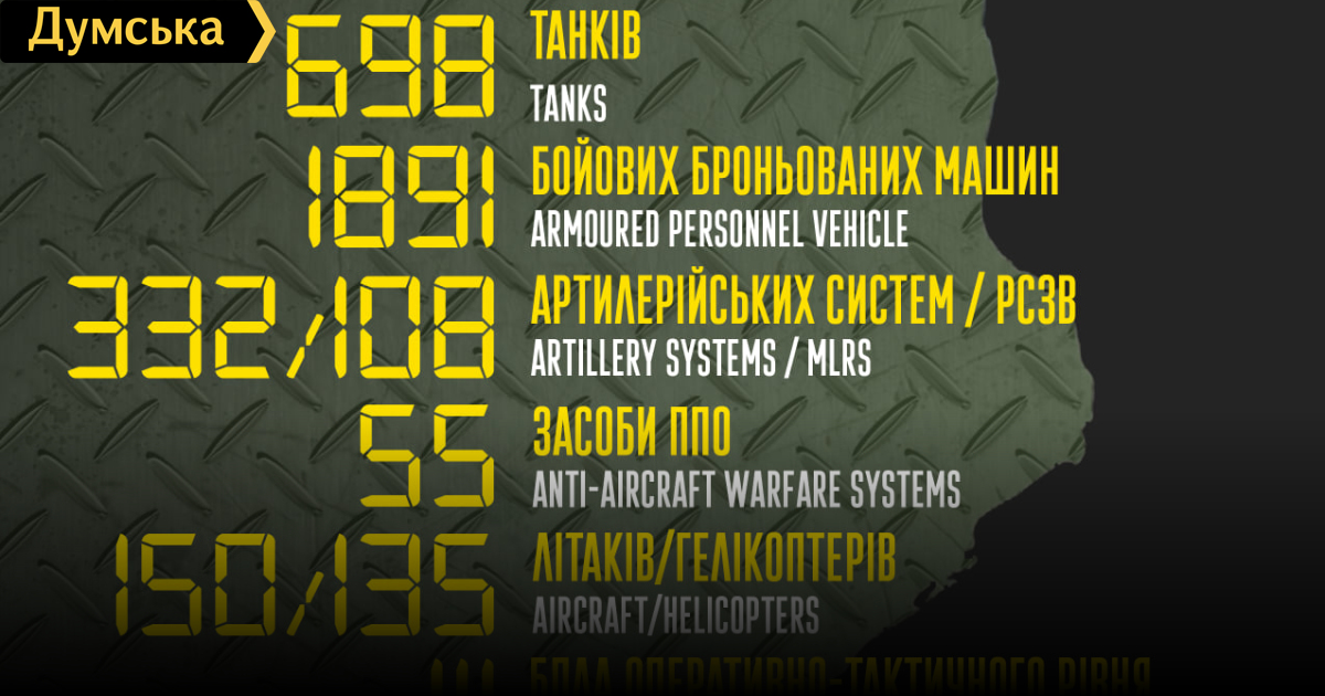 Генеральный штаб Вооруженных сил Украины опубликовал новые данные о вражеских потерях. Так, по данным ведомства, с 24 февраля российские войска потеряли в Украине 18900 солдат и офицеров. Подбиты или захвачены, как трофей, 698 танков и 1891 бронемашин, а также 332 артиллерийские системы, 108 реактивных систем залпового огня, 55 систем ПВО, четыре пусковые установки оперативно-тактических ракет, 1358 грузовиков и автомобилей, 76 цистерн с горючим, 25 единиц специальной техники. Сбиты или сожжены на земле 150 самолетов, 135 вертолетов, 111 беспилотников оперативно-тактического уровня. Вражеский флот потерял два корабля и пять катеров. СМЕРТЬ РОСІЙСЬКИМ ОКУПАНТАМ! Помітили помилку? Виділяйте слова з помилкою та натискайте control-enter |