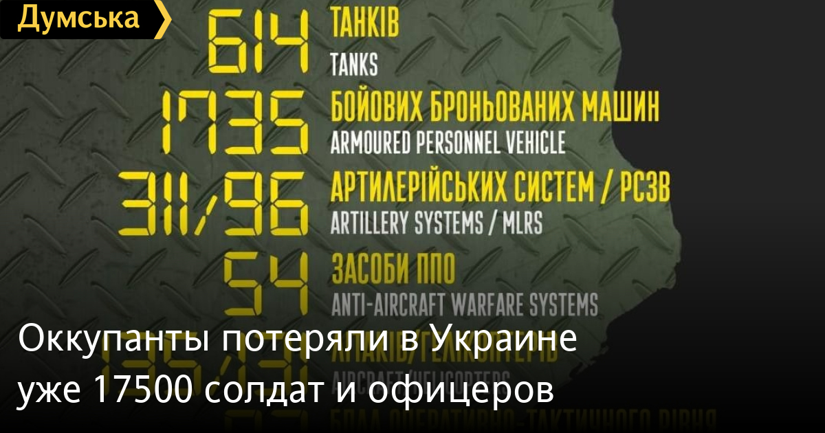 По данным Генштаба, с начала вторжения российские нацисты потеряли в Украине 17500 солдат и офицеров.