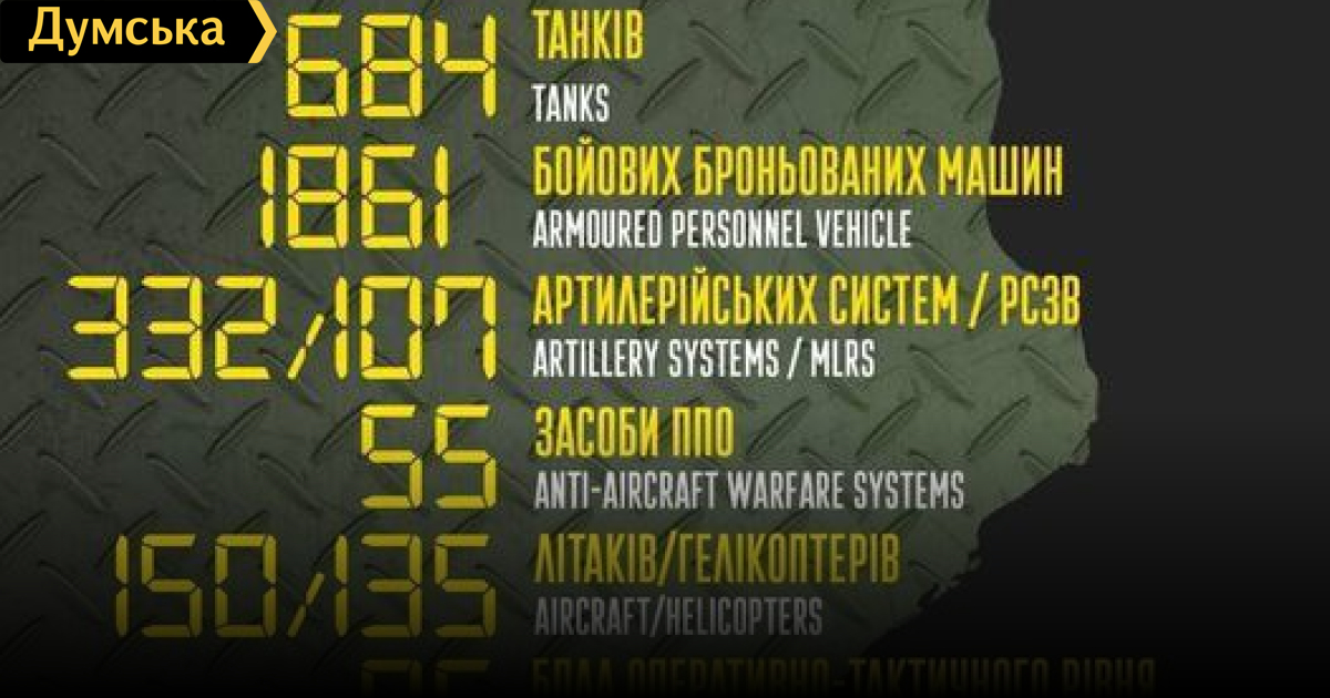 Генеральный штаб Вооруженных сил Украины опубликовал новые данные о вражеских потерях. По данным ведомства, с начала российского вторжения армия противника потеряла 18600 солдат и офицеров. Подбиты или захвачены, как трофей, 684 танка, 1861 бронемашина, 332 артиллерийские системы, 107 реактивных систем залпового огня, четыре пусковые установки оперативно-тактических ракет, 55 систем ПВО, 1324 грузовиков и автомобилей, 76 цистерн с горючим и 25 единиц спецтехники. Сбиты или уничтожены на земле 150 самолетов, 135 вертолетов, 96 беспилотников оперативно-тактического уровня. Российский флот потерял два корабля и пять катеров. СМЕРТЬ РОСІЙСЬКИМ ОКУПАНТАМ! Помітили помилку? Виділяйте слова з помилкою та натискайте control-enter |