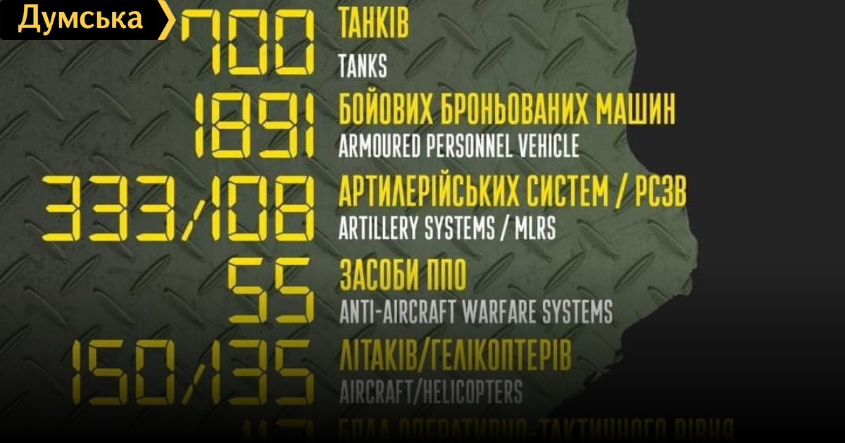 Российская армия потеряла 19000 солдат и офицеров после начала полномасштабного вторжения в Украину 24 февраля. Новую сводку о вражеских потерях предоставили в Генерельном штабе Вооруженных сил Украины. Так, по состоянию на утро 8 апреля были уничтожены или захвачены, как трофей, 700 российских танков и 1891 бронемашина, 333 артиллерийские системы, 108 реактивных систем залпового огня, четыре пусковые установки оперативно-тактических ракет, 55 систем ПВО, 1361 автомобиль, 76 цистерн с горючим, 25 единиц спецтехники. Сбиты 150 самолетов, 135 вертолетов, 112 беспилотников оперативно-тактического уровня. Вражеский флот потерял два корабля и пять катеров. СМЕРТЬ РОСІЙСЬКИМ ОКУПАНТАМ! Помітили помилку? Виділяйте слова з помилкою та натискайте control-enter |