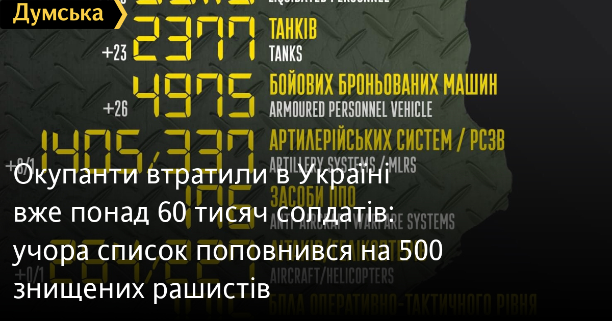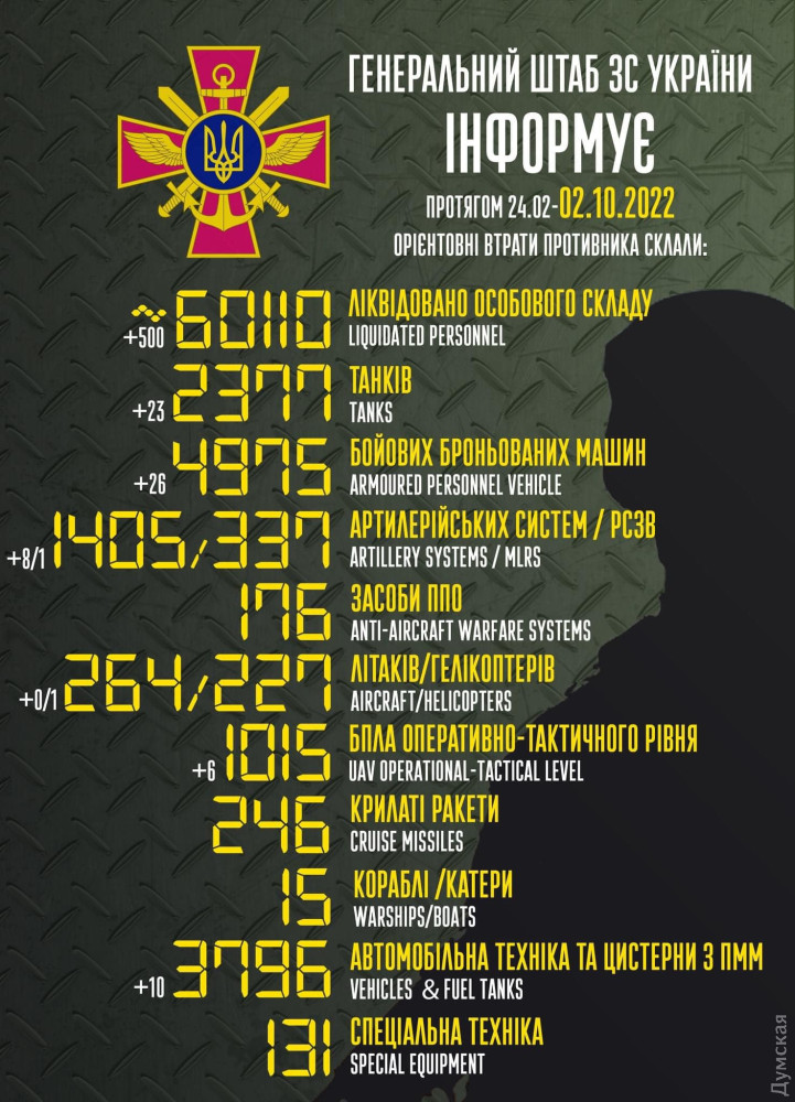 Втрати російських окупаційних військ в Україні з 24 лютого перевищили 60 тисяч солдатів та офіцерів. 1 жовтня було ліквідовано ще 500 ворожих військових.
