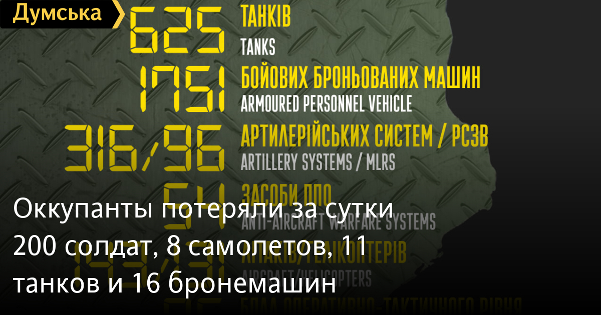 Уничтожены или захвачены, как трофей, 625 танков (+11), 1751 бронемашин (+16), 316 артиллерийских систем (+16), четыре пусковые установки оперативно-тактических ракет, 54 системы ПВО, 1220 автомобилей (+19), 76 цистерн с горючим (+1).