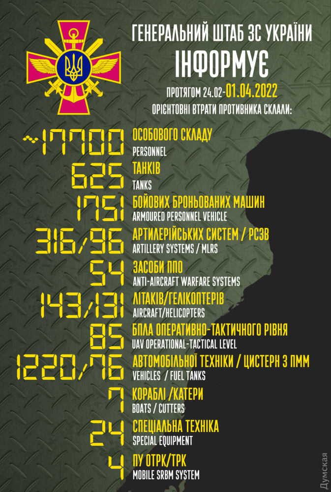 На 37-й день войны российские нацисты потеряли в Украине 17700 солдат и офицеров (+200 за последние сутки).