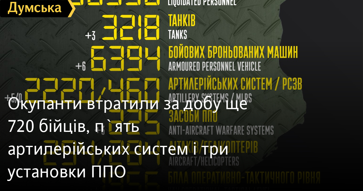 За даними Генерального штабу Збройних сил України, напередодні було підбито три ворожі танки (3218 за весь час), шість бронемашин (6394), 13 вантажівок (5081) і одну одиницю спецтехніки (203).