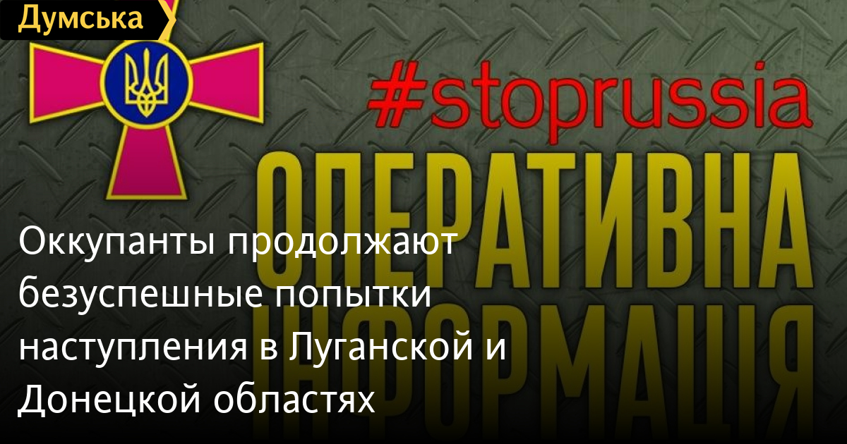 Окупанти продовжують безуспішні спроби наступу у Луганській та Донецькій областяхОкупанти 8 листопада намагалися наступати в районі Білогорівки та Новоселівського в Луганській області, а також Бахмута, Бахмутського, Білогорівки, Веселого, Клещіївки, Майорська, Новомихайлівки, Опитного, Павлівки, Першотравневого, Соледара та Яковлівки у Донецькій області. Успіху не мали. Про це повідомили у Генеральному штабі Збройних сил України. За добу окупанти завдали семи ракетних та 32 авіаційних ударів, здійснили понад 70 обстрілів із реактивних систем залпового вогню. Під ворожий вогонь потрапило понад 35 населених пунктів у Сумській, Харківській, Луганській, Донецькій, Запорізькій, Херсонській та Миколаївській областях. Українська авіація завдала 18 ударів по ворогам — уражено чотири взводні опорні пункти, десять районів зосередження живої сили та техніки, чотири позиції ППО. За добу наші зенітники збили п'ять російських дронів-камікадзе «Ланцет» та чотири «Орлани». Артилерія та ракетні підрозділи завдали чотирьох ударів по районах зосередження ворожих військ. За уточненою інформацією, внаслідок обстрілу 6 листопада у Запорізькій області було знищено 15 одиниць ворожої техніки, вбито та поранено до 150 окупантів. СМЕРТЬ РОСІЙСЬКИМ ОКУПАНТАМ! Помітили помилку? Виділяйте слова з помилкою та натискайте control-enter |