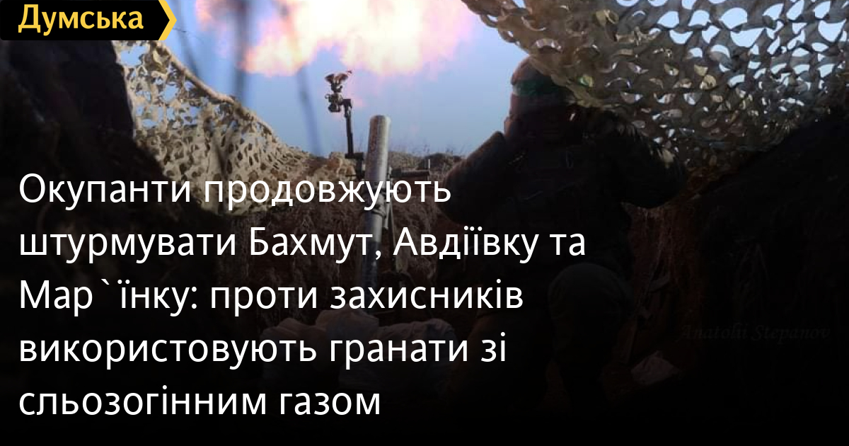 Окупанти продовжують штурмувати Бахмут, Авдіївку та Мар`їнку: проти захисників використовують гранати зі сльозогінним газомРосійські нацисти 27 березня здійснили 41 атаку на українські позиції. Головні бої тривають у районі Бахмута, Авдіївки та Мар'їнки. У Генштабі повідомили, що противник продовжує штурмувати Бахмут, також протягом дня окупанти намагалися просунутися в районі села Іванівське на цьому напрямку. На авдіївському та мар'їнському напрямках рашисти атакували Новокалинівське, Степове, Авдіївку, Сіверне, Первомайське, Невельське та Мар'їнку, але успіхів не мали. У цьому районі бойових дій ворог використовує проти наших солдатів гранати зі сльозогінним газом. Також російські війська продовжують невдалі спроби наступу в районі Куп'янська та Лиману — безуспішно намагалися рухатися в районі Синьківки та Білогорівки. У Запорізькій та Херсонській областях окупанти обороняються. За день противник здійснив сім авіаційних і десять ракетних ударів, понад 15 разів використовував реактивні системи залпового вогню. Українська авіація відповіла дев'ятьма ударами по районах зосередження ворожих сил, вразила російський зенітно-ракетний комплекс. Українська ППО збила ворожий дрон-розвідник «Орлан-10». Ракетні війська та артилеристи вразили два пункти управління та райони зосередження ворожих сил. СМЕРТЬ РОСІЙСЬКИМ ОКУПАНТАМ! Помітили помилку? Виділяйте слова з помилкою та натискайте control-enter |
