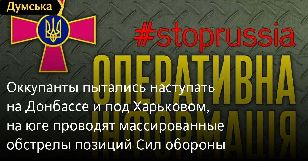 Окупанти намагалися наступати на Донбасі та під Харковом, на півдні проводять масовані обстріли позицій Сил оборониРосійські окупанти зробили кілька нових спроб наступати на різних напрямках, але не змогли досягти успіху. У зведенні Генерального штабу Збройних сил України вказується, що на Харківщині росіяни намагалися просунутися в районі прикордонних сіл Кочубеївка та Дементьєвка, отримали відсіч і відійшли. На північний захід від Слов'янська противник намагався вести розвідку в районі села Мазанівка. Окупантів виявили та знищили. На бахмутському напрямку вороги наступали у районі околиць Берестового, успіхів не досягли та відійшли. Також ситуація склалася і в районі Володимирівки – Яківлівки та Семигір'я – Кодеми. На напрямках Володимирівка – Соледар та Покровське – Бахмут бої продовжуються. На лініях Відродження – Кодема та Доломітне – Семигір'я наші захисники завдали противнику потужного удару та змусили відійти. Уздовж усієї лінії фронту тривають масовані артобстріли позицій Сил оборони України. У тому числі окупанти активізували свою артилерію на південнобузькому напрямку. СМЕРТЬ РОСІЙСЬКИМ ОКУПАНТАМ! Помітили помилку? Виділяйте слова з помилкою та натискайте control-enter |