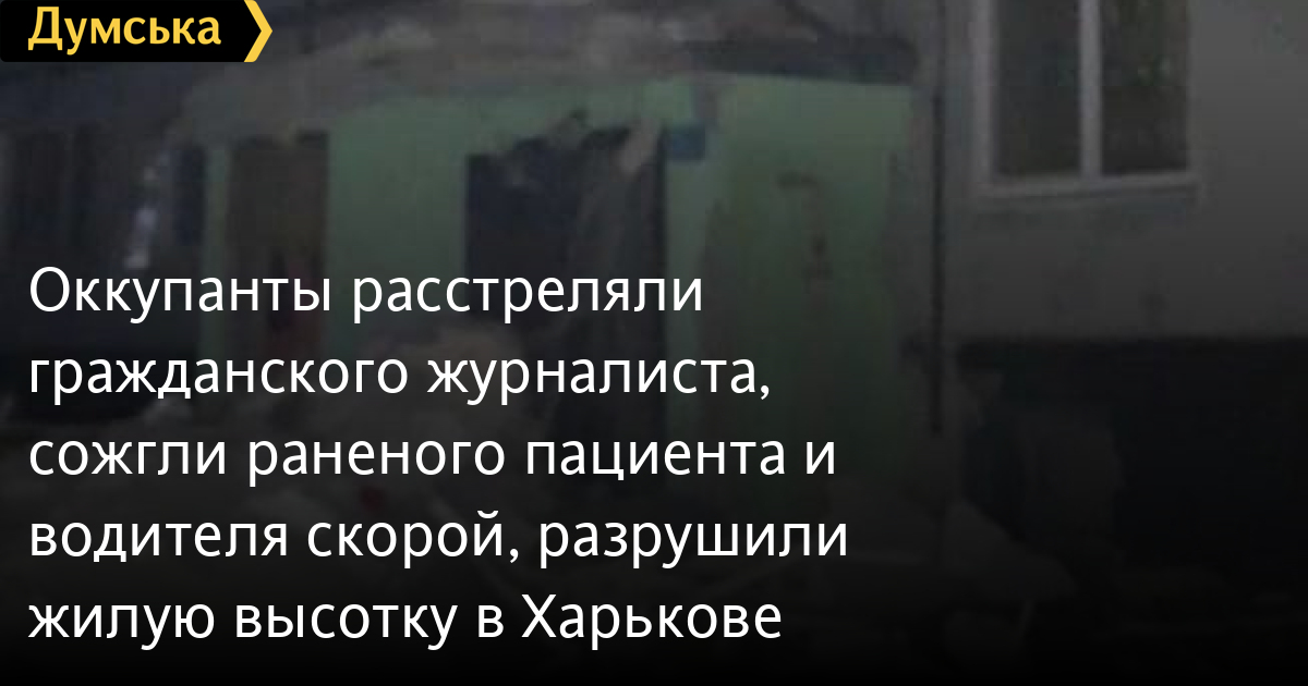 Как сообщает генеральный прокурор Украины Ирина Венедиктова, за сегодняшний день россияне расстреляли гражданского журналиста, сожгли пациента и водителя скорой и разрушили жилую высотку в Харькове.