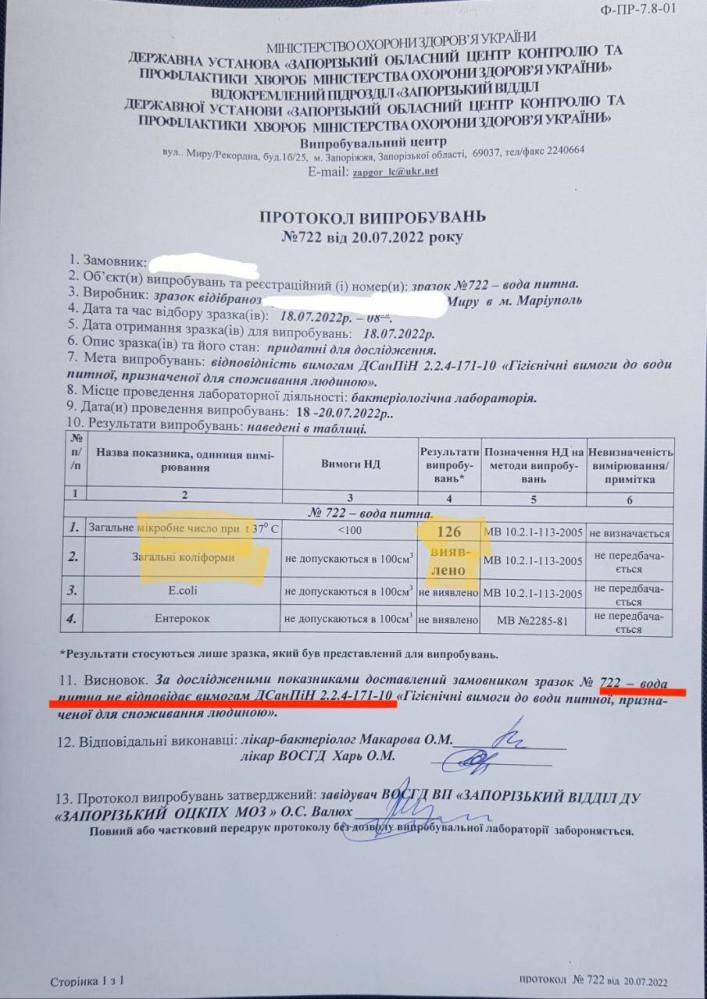 За результатами дослідження бактеріологічної лабораторії Запорізького центру контролю та профілактики хвороб, у воді виявлені коліформні бактерії. Тобто вода змішана з фекальною речовиною і пити її небезпечно для здоров'я.