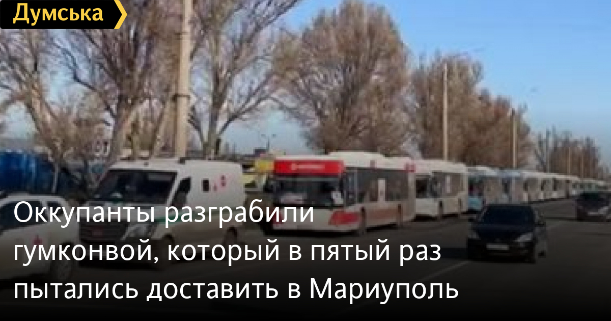«Гуманитарный конвой, направлявшийся в Мариуполь, на всем пути следования подконтрольной российским войскам территорией, на каждом блокпосту до населенного пункта Токмак разворовывался российскими оккупантами, которые насильно изымали продукты питания, одежду, предметы личной гигиены», — говорится в сообщении.