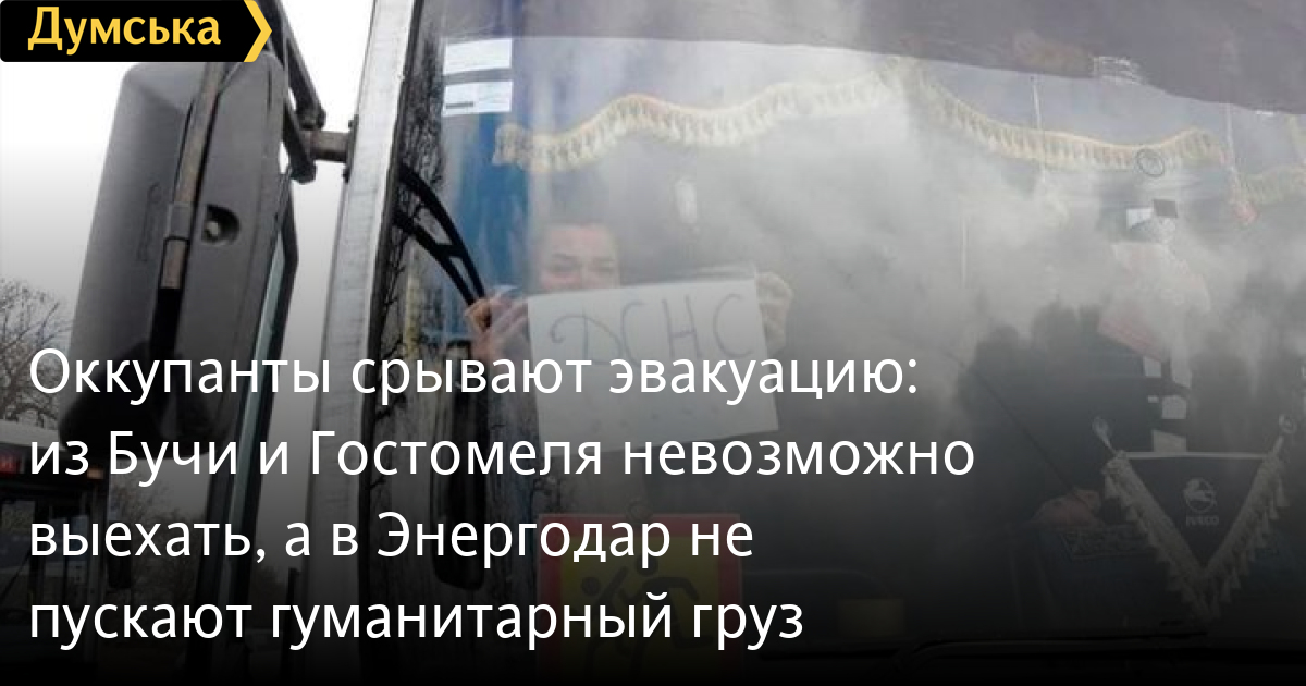Оккупанты срывают эвакуацию: из Бучи и Гостомеля невозможно выехать, а в Энергодар не пускают гуманитарный грузРоссийские нацисты заблокировали эвакуационную колонну из Бучи и Гостомеля Киевской области. Машины с гуманитарной помощью не могут доехать до Энергодара. 50 автобусов не могут выехать из Бучи и Гостомеля Киевской области. Транспорт блокируют российские оккупационные войска. «Из Бучи и Гостомеля сегодня невозможно эвакуировать жителей. Договориться с оккупантами так и не удалось: 50 автобусов остаются заблокированными. Из Ворзеля эвакуация продолжается: уже второй спасательный круг совершили водители и перевозят жителей в Киев», — заявляют в Бучанском горсовете. С «зеленым коридором» в Энергодар тоже возникли проблемы. Туда не может прибыть гуманитарный груз. Машины с продуктами и лекарствами остановили возле Васильевки. Об этом сообщил мэр Энергодара Дмитрий Орлов. Гуманитарную помощь с лекарствами и продуктами из Запорожья оккупанты не пропускают дальше Васильевки. «Колонна доехала до Васильевки. Вопрос дальнейшего движения сейчас решается на уровне продолжающихся межгосударственных переговоров. Результаты сообщим, как только получим информацию», — написал мэр Энергодара Дмитрий Орлов. Отметим, по договоренности режим прекращения огня должен продолжаться 9 марта с 09:00 до 21:00. Оговорены были следующие направления: Энергодар – Запорожье Сумы – Полтава Мариуполь – Запорожье Волноваха – Покровск Изюм – Лозовая Ворзель, Буча, Бородянка, Ирпень, Гостомель – Киев. СМЕРТЬ РОССИЙСКИМ ОККУПАНТАМ! Заметили ошибку? Выделяйте слова с ошибкой и нажимайте control-enter |