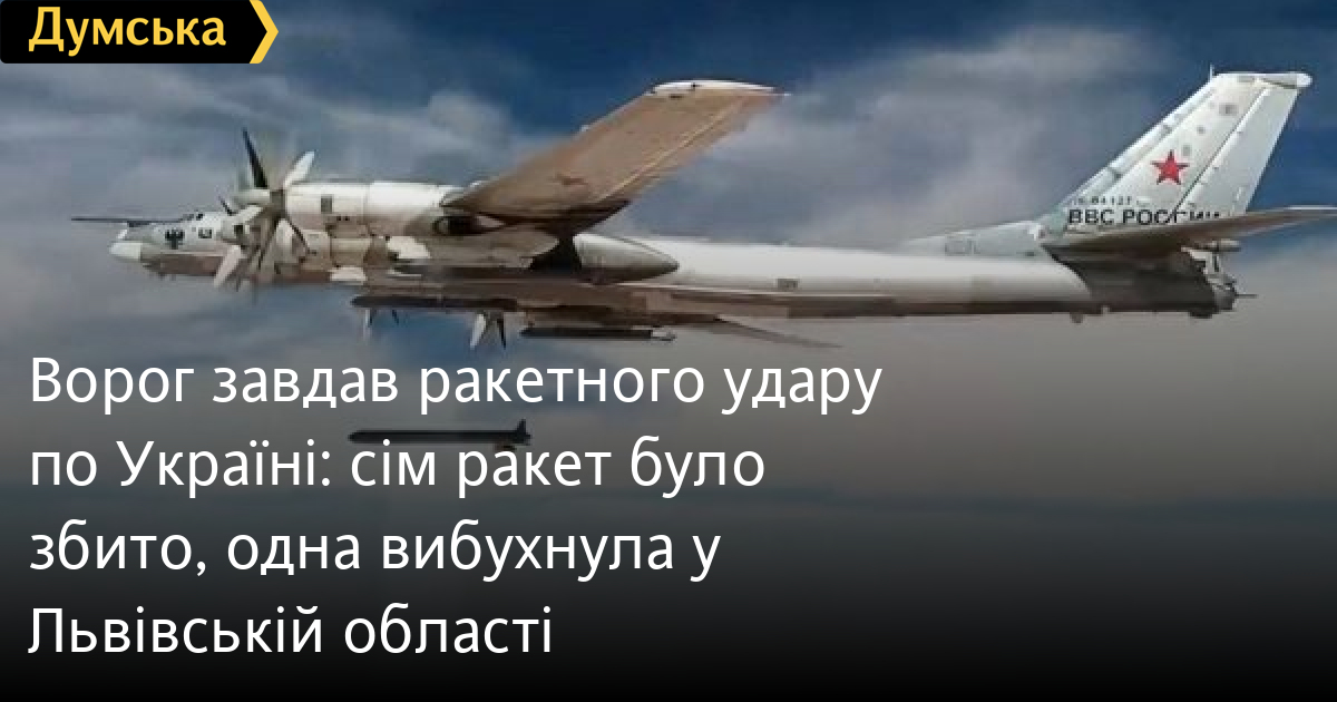 У Повітряному командуванні Збройних сил України повідомили, що противник запустив вісім ракет типу Х-101 зі стратегічних бомбардувальників Ту-95 над акваторією Каспійського моря. Шість ракет було збито силами ППО, ще одну знищив винищувач.