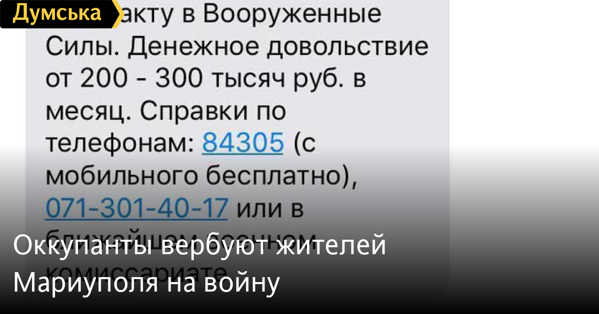 Жителям тимчасово окупованого та зруйнованого російськими нацистами міста-героя Маріуполя почали приходити СМС із пропозицією записатися на військову службу за контрактом до збройних сил Росії. Як повідомили представники міської ради, за участь у війні проти своєї батьківщини маріупольцям обіцяють 200-300 тисяч рублів щомісяця. Таким чином серед мешканців почалася прихована мобілізація. СМЕРТЬ РОСІЙСЬКИМ ОКУПАНТАМ! Помітили помилку? Виділяйте слова з помилкою та натискайте control-enter |