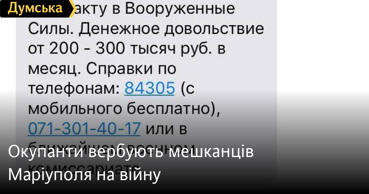 Жителям тимчасово окупованого та зруйнованого російськими нацистами міста-героя Маріуполя почали приходити СМС із пропозицією записатися на військову службу за контрактом до збройних сил Росії. Як повідомили представники міської ради, за участь у війні проти своєї батьківщини маріупольцям обіцяють 200-300 тисяч рублів щомісяця. Таким чином серед мешканців почалася прихована мобілізація. СМЕРТЬ РОСІЙСЬКИМ ОКУПАНТАМ! Помітили помилку? Виділяйте слова з помилкою та натискайте control-enter |
