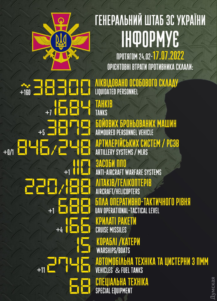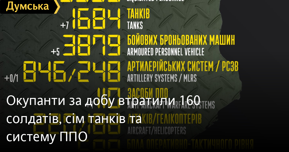 По данным Генерального штаба Вооруженных сил Украины, накануне были уничтожены семь вражеских танков (1684), пять бронемашин (3879), 11 грузовиков (2746), одна реактивная система залпового огня (248) и одна система ПВО (110).