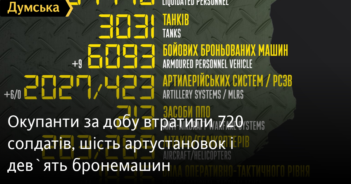 Окупанти за добу втратили 720 солдатів, шість артустановок і дев`ять бронемашинСили оборони України 1 січня знищили 720 ворожих солдатів і офіцерів. Від початку вторгнення рашисти втратили вже 107 440 військовослужбовців. За даними Генерального штабу Збройних сил України, наші воїни вчора знищили дев'ять бойових броньованих машин (6093 з 24 лютого), шість артилерійських систем (2027) і п'ять вантажівок (4725). ППО збила 44 ворожі безпілотники (1836). СМЕРТЬ РОСІЙСЬКИМ ОКУПАНТАМ! Помітили помилку? Виділяйте слова з помилкою та натискайте control-enter |