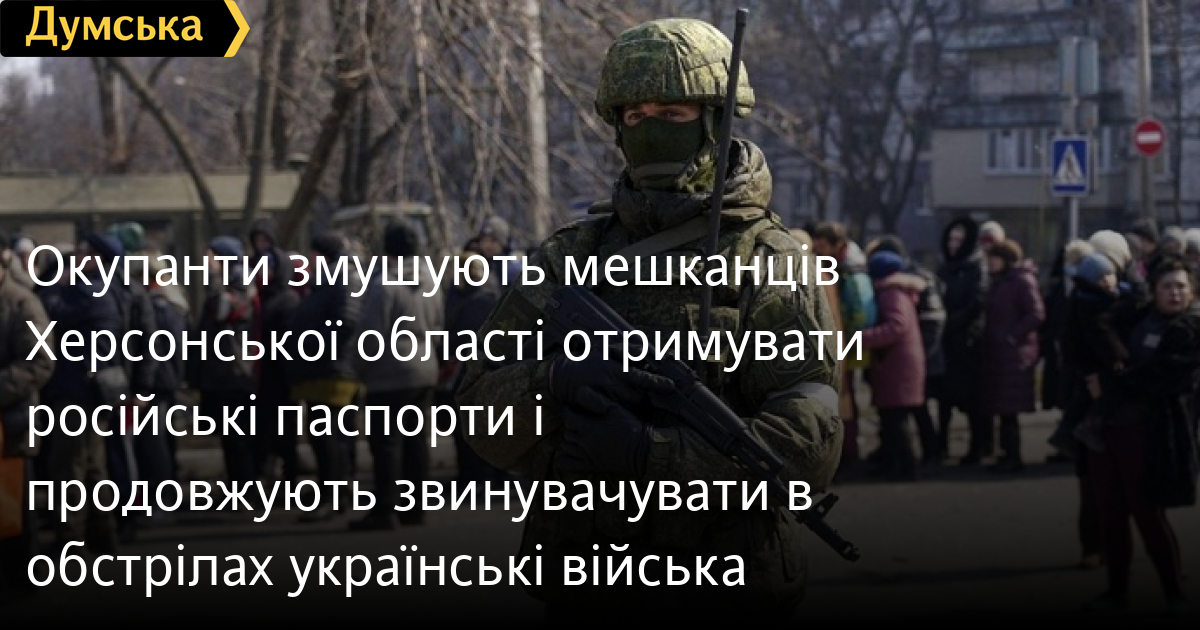 Окупанти змушують мешканців Херсонської області отримувати російські паспорти і продовжують звинувачувати в обстрілах українські військаРосійські нацисти 20 лютого знову обстріляли з артилерії тимчасово окуповане місто Гола Пристань на Херсонщині і заявили, що удар завдали українські війська. У Генштабі Збройних сил України повідомили, що загарбники періодично вдаються до таких провокацій на окупованих територіях з метою дискредитувати Сили оборони. Також на окупованих територіях Херсонської області триває примусова видача паспортів рф. У Скадовську та Каланчаку окупанти змушують людей отримувати ворожі документи, погрожуючи конфіскувати майно або відібрати бізнес. Пенсіонерам погрожують позбавити їх виплат. Тим часом тривають запеклі бої на сході країни. Вороги продовжують атакувати на куп'янському, лиманському, бахмутському, авдіївському та шахтарському напрямках. За день ворожа авіація завдала 22 удари, також окупанти здійснили три ракетні обстріли та понад 30 разів відкривали вогонь із реактивних систем залпового вогню. Наша авіація 16 разів ударила по районах зосередження сил противника, а також по зенітно-ракетному комплексу та вогневій позиції. СМЕРТЬ РОСІЙСЬКИМ ОКУПАНТАМ! Помітили помилку? Виділяйте слова з помилкою та натискайте control-enter |
