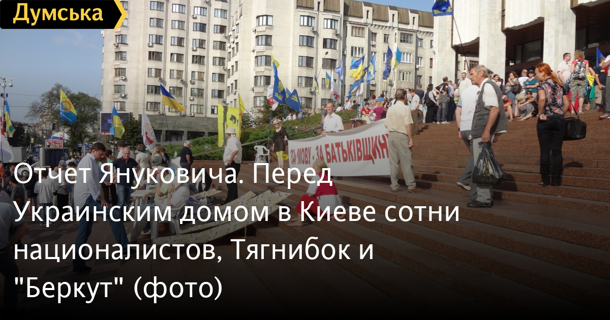 Всего на Крещатике собралось несколько сотен демонстрантов. Большинство – сторонники партии «Свобода» и других организаций националистического толка. Здесь же корреспондент «Думской» заметил и лидера «свободовцев» Олега Тягнибока. Последний расставлял людей у входа в Украинский дом призывал людей держаться и «відстоювати рідну мову».
