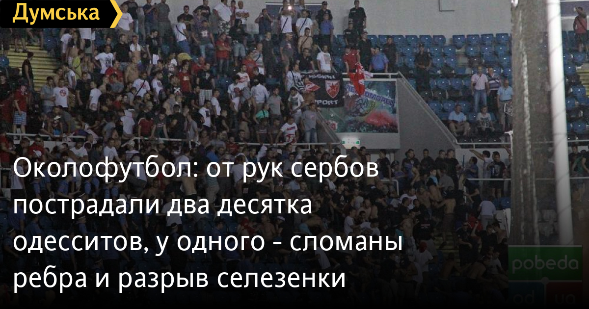 Околофутбол: от рук сербов пострадали два десятка одесситов, у одного — сломаны ребра и разрыв селезенкиКак минимум два десятка болельщиков одесского «Черноморца» пострадали в результате столкновения с фанами белградской «Црвены Звезды» во время вчерашнего матча на стадионе «моряков» в парке Шевченко. Кроме того, как рассказал нашим партнерам из «Победы» генеральный директор «Черноморца» Сергей Керницкий, один из одесситов покинул стадион в карете скорой помощи с переломанными ребрами и разрывом селезенки. Его госпитализировали в областную клиническую больницу. Среди пострадавших есть также милиционер и несколько стюардов. Напомним, побоище произошло на 77-й минуте игры, после того, как судья назначил пенальти в ворота сербов, который успешно пробил Алексей Антонов. Иностранцы несколькими волнами пытались атаковать трибуны фанатов «моряков», забрасывая их отломанными сиденьями и бутылками с водой. Утихомирили их бойцы «Беркута». СМЕРТЬ РОССИЙСКИМ ОККУПАНТАМ! Заметили ошибку? Выделяйте слова с ошибкой и нажимайте control-enter |